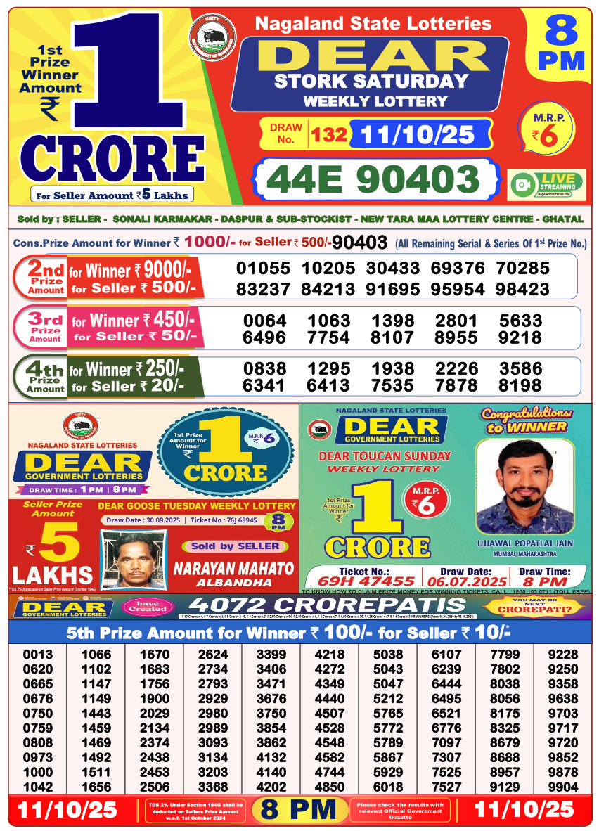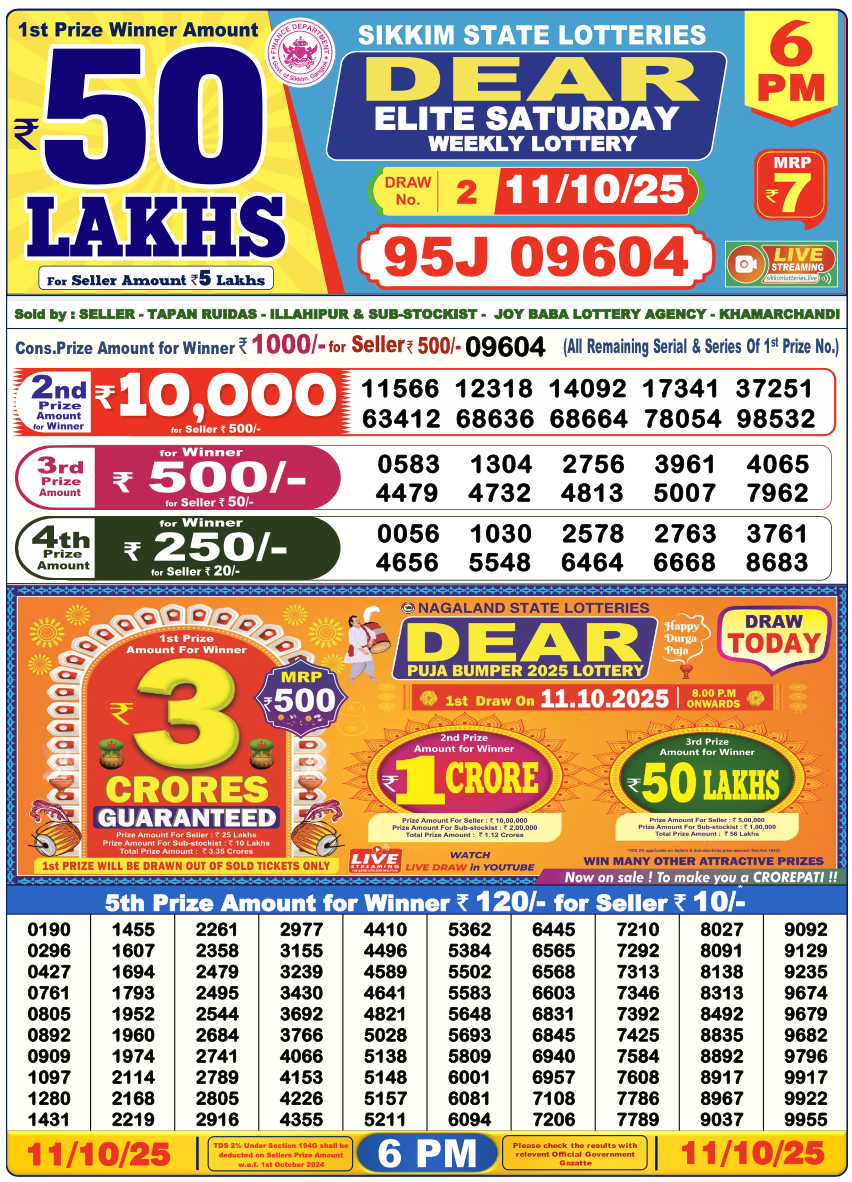 Lottery Sambad 11.10.2025 Result Today 1 PM, 6 PM, 8 PM Nagaland State Lottery LIVE
