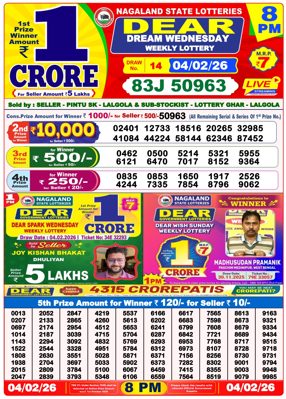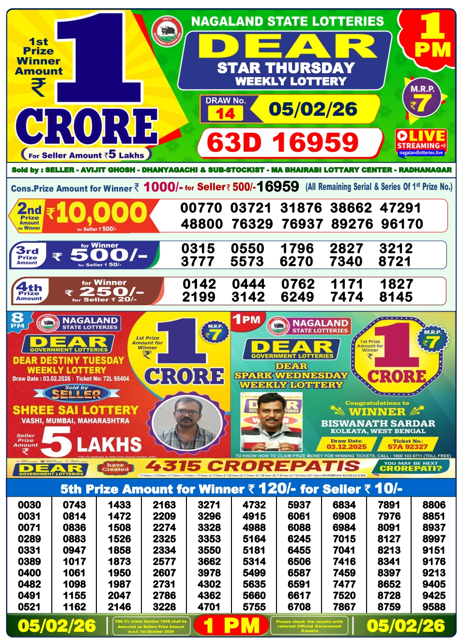 Lottery Sambad 5.2.2026 Result Today 1 PM, 6 PM, 8 PM Nagaland State Lottery LIVE