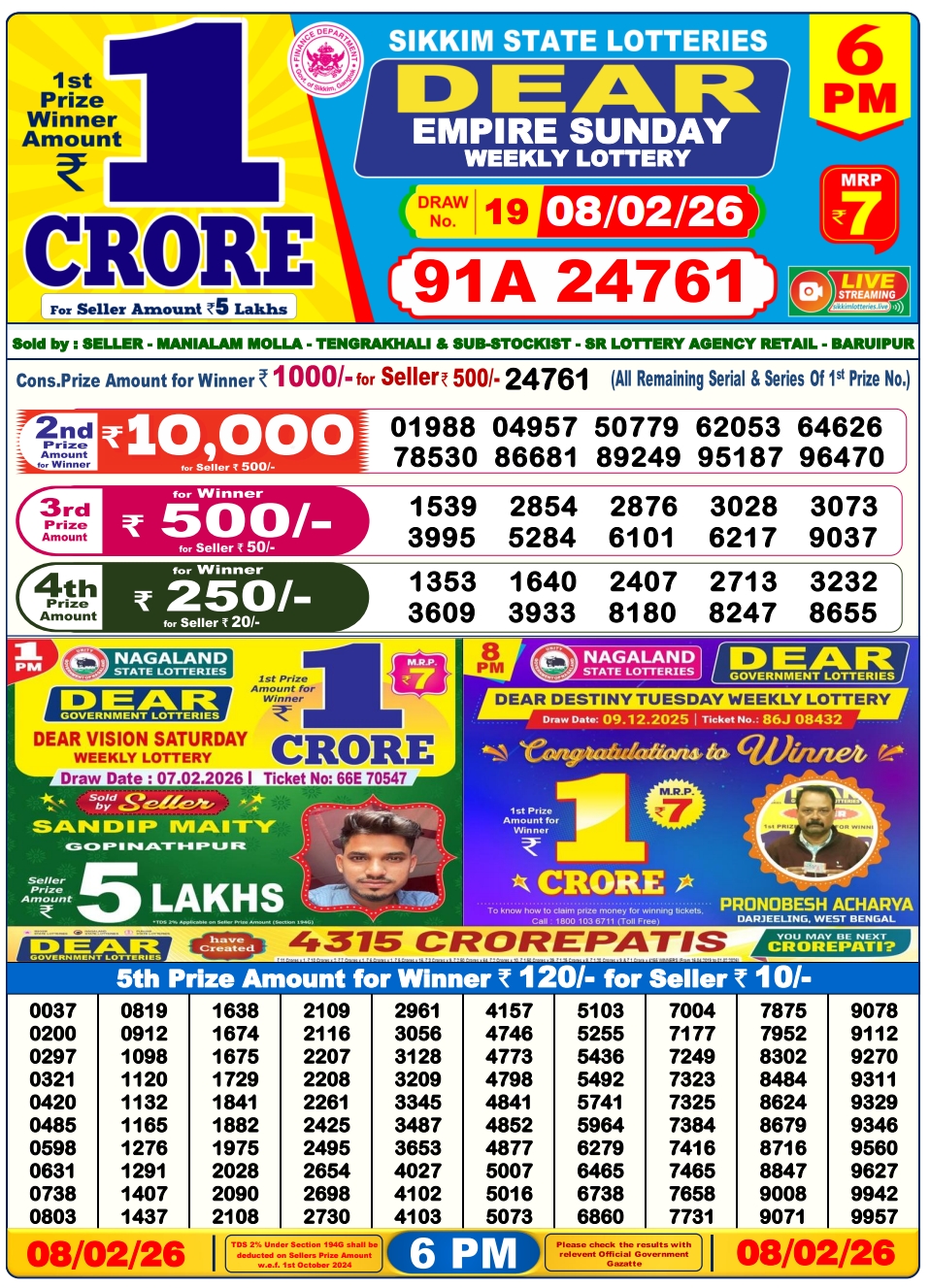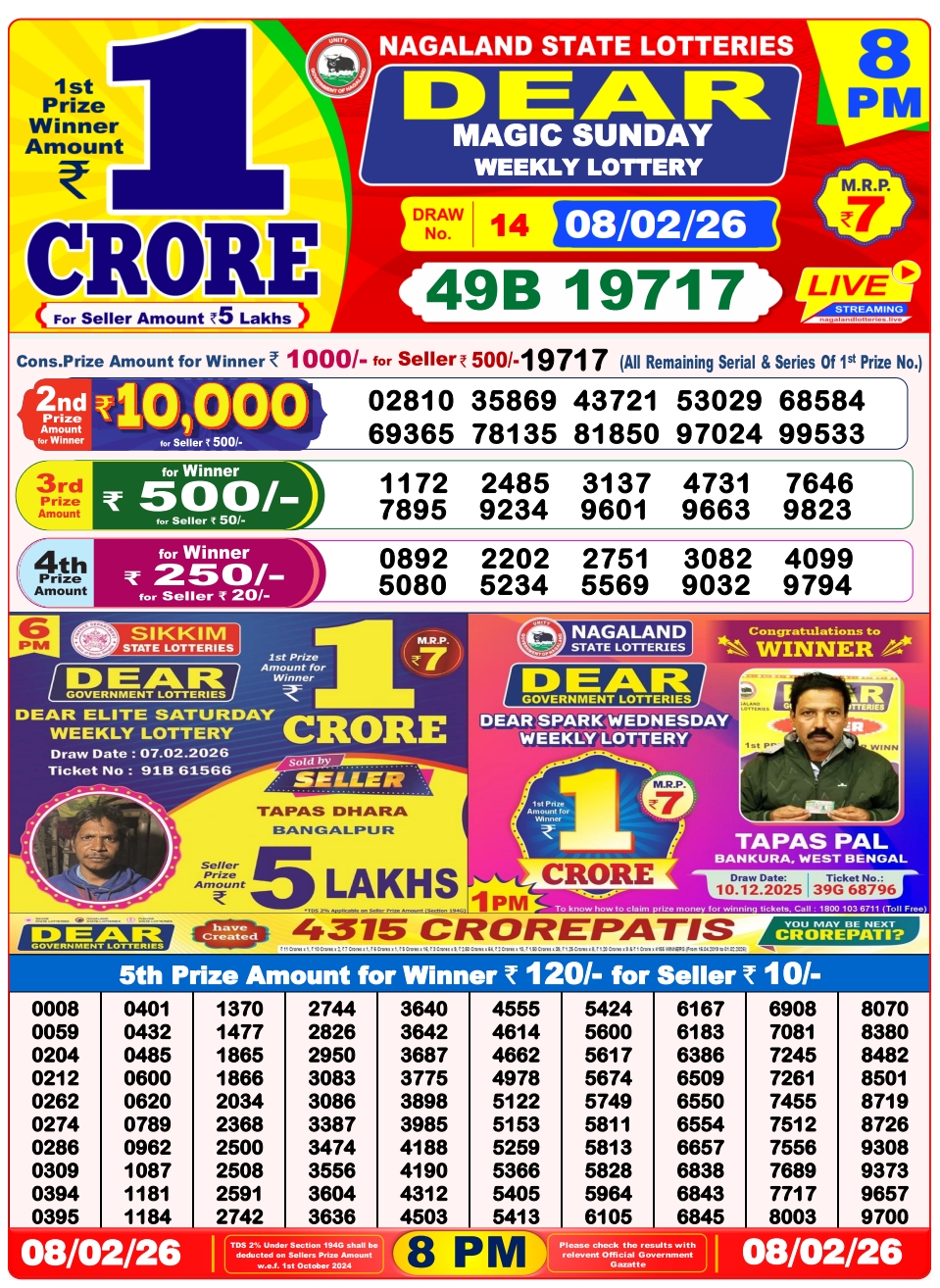 Lottery Sambad 7.2.2026 Result Today 1 PM, 6 PM, 8 PM Nagaland State Lottery LIVE