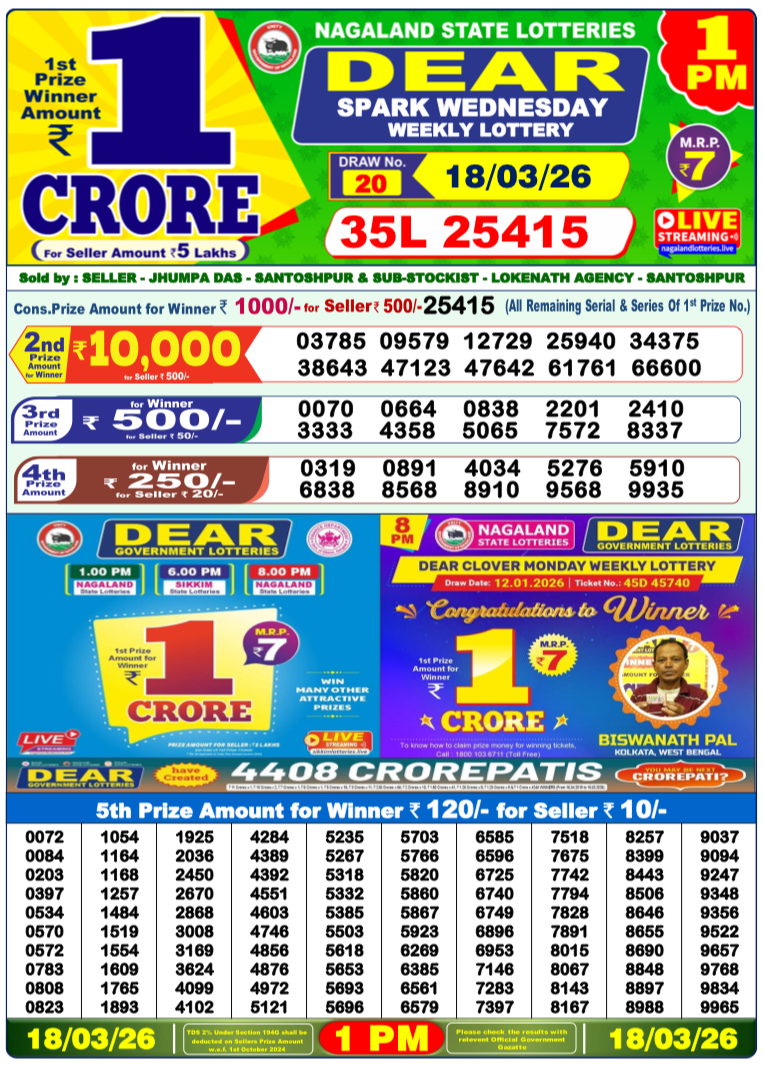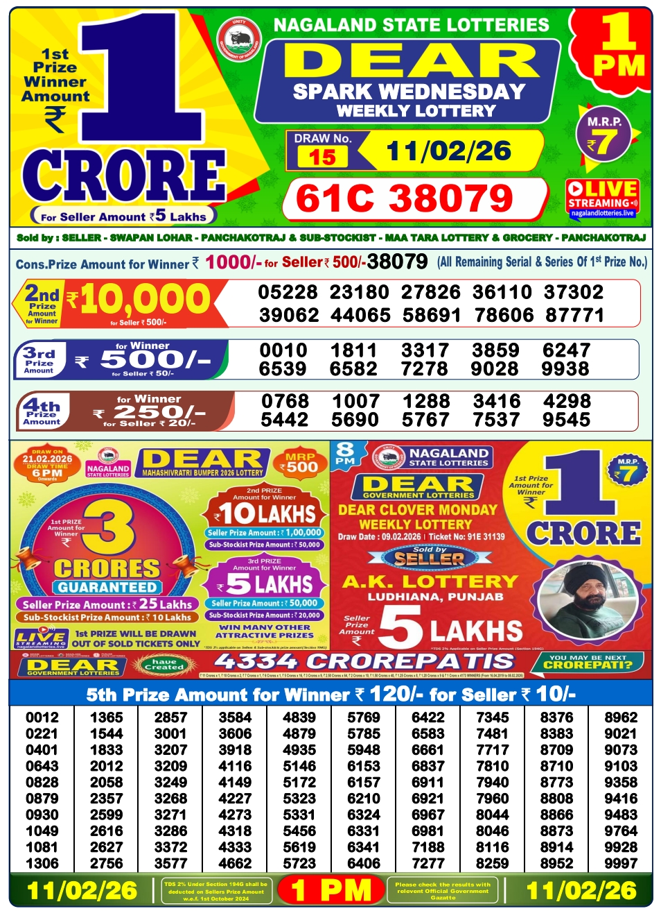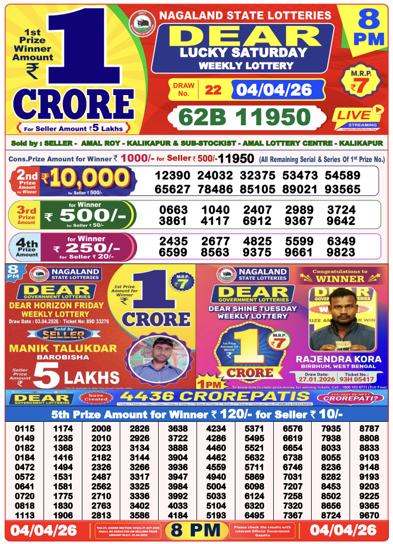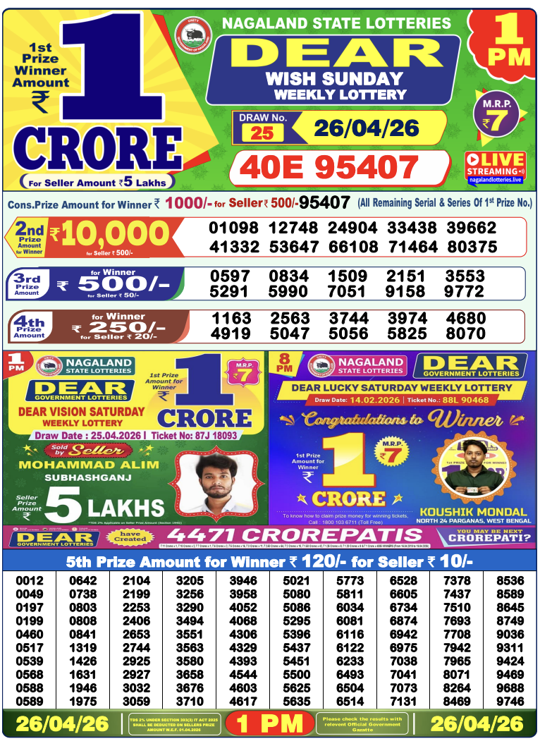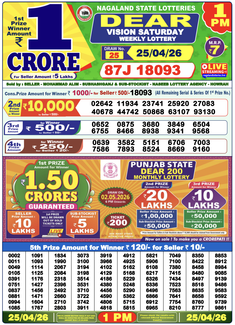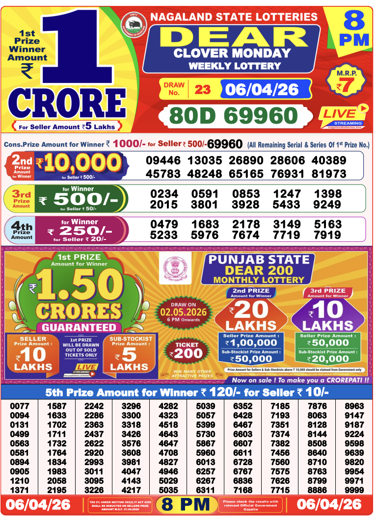 Nagaland Lottery Sambad is a government-run daily lottery system operated by the Nagaland State Government. It is fully legal and conducted under strict rules. The lottery publishes results three times every day, making it one of the most active lotteries in India.