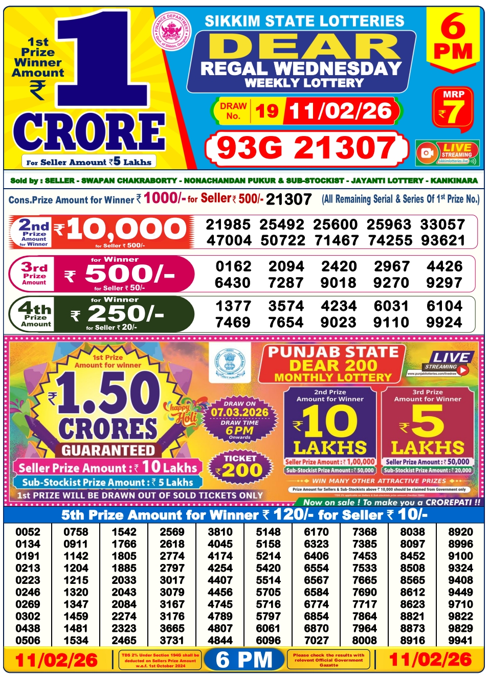 Lottery Sambad 10.2.2026 Result Today 1 PM, 6 PM, 8 PM Nagaland State Lottery LIVE
