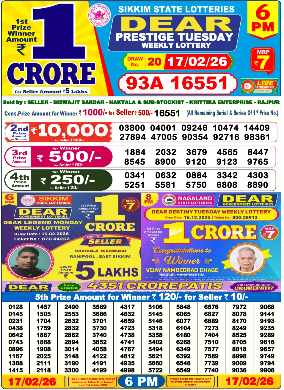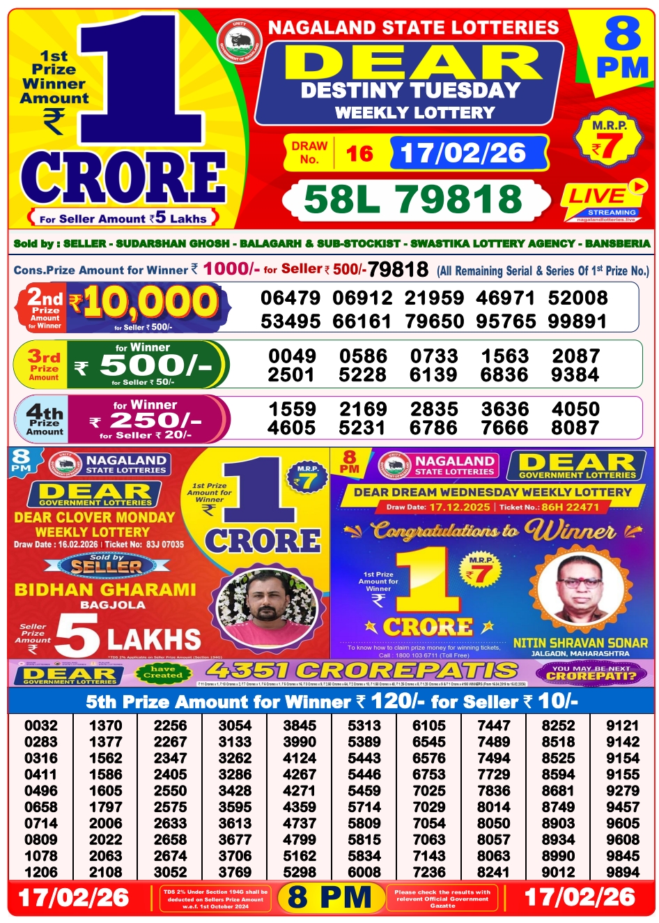 Lottery Sambad 17.2.2026 Result Today 1 PM, 6 PM, 8 PM Nagaland State Lottery LIVE