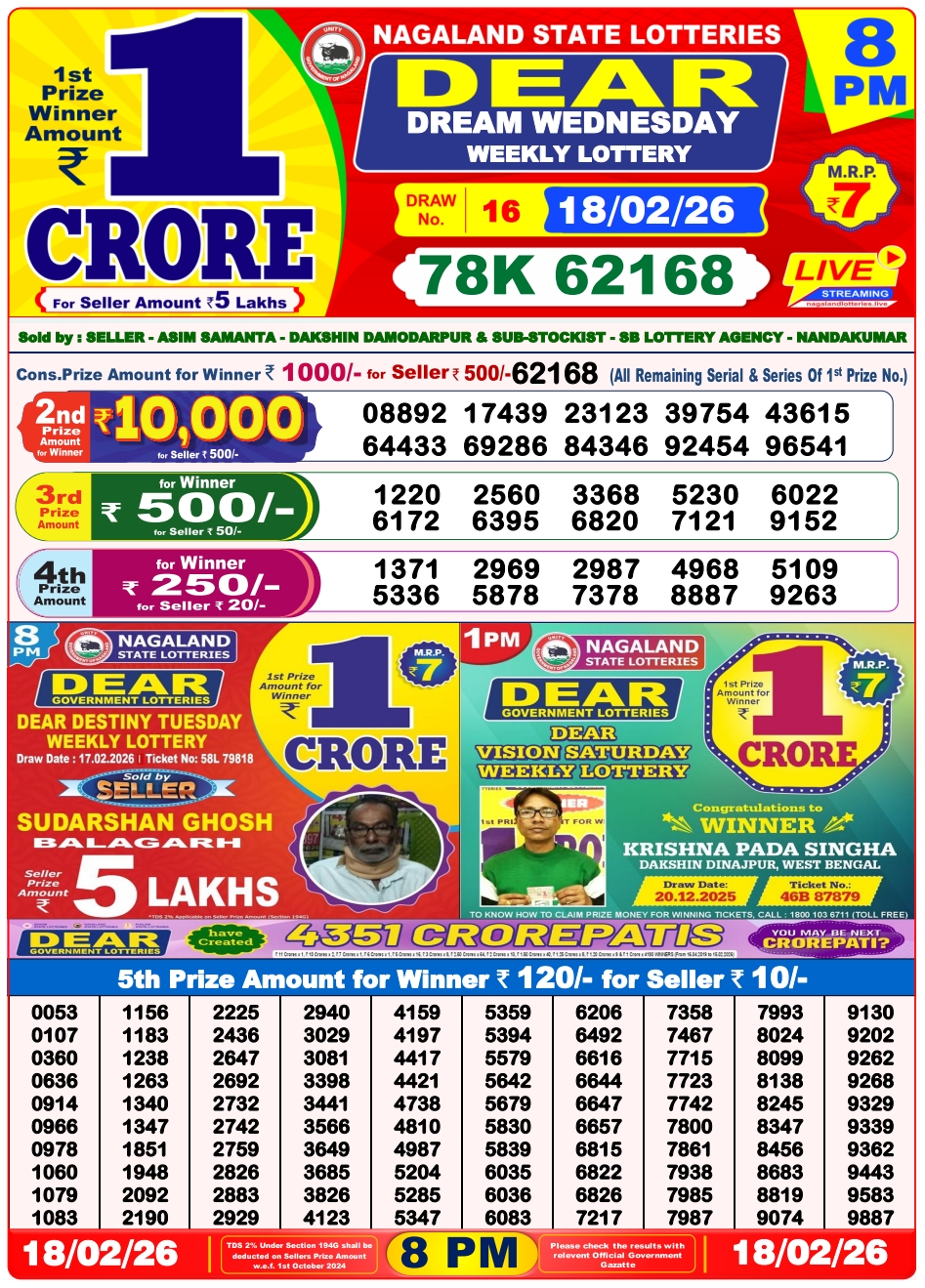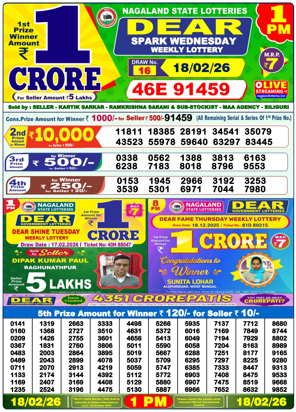 Lottery Sambad 18.2.2026 Result Today 1 PM, 6 PM, 8 PM Nagaland State Lottery LIVE
