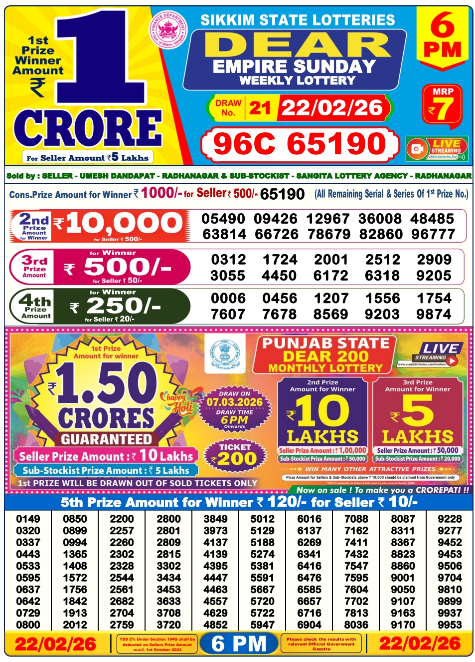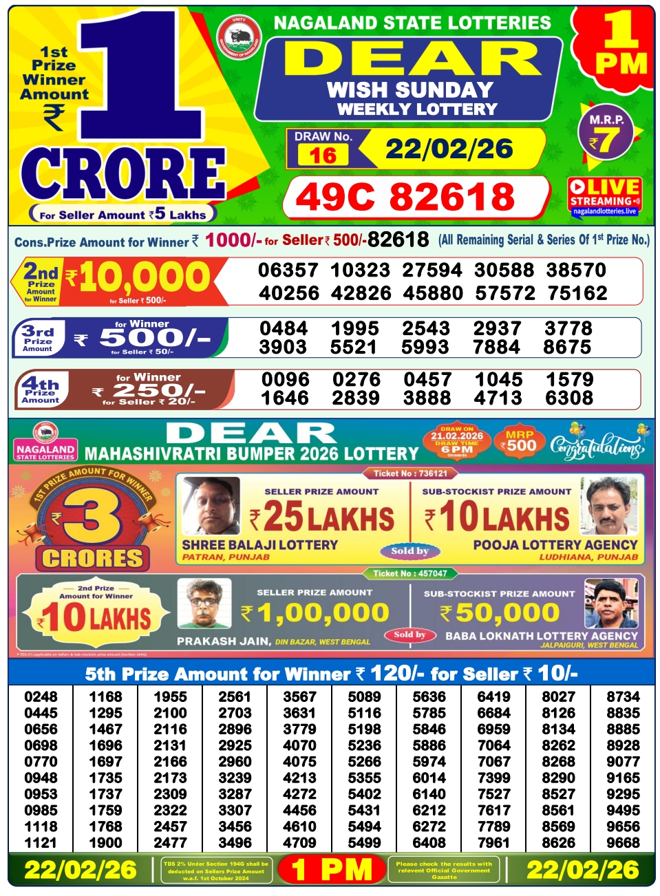 Lottery Sambad 22.2.2026 Result Today 1 PM, 6 PM, 8 PM Nagaland State Lottery LIVE