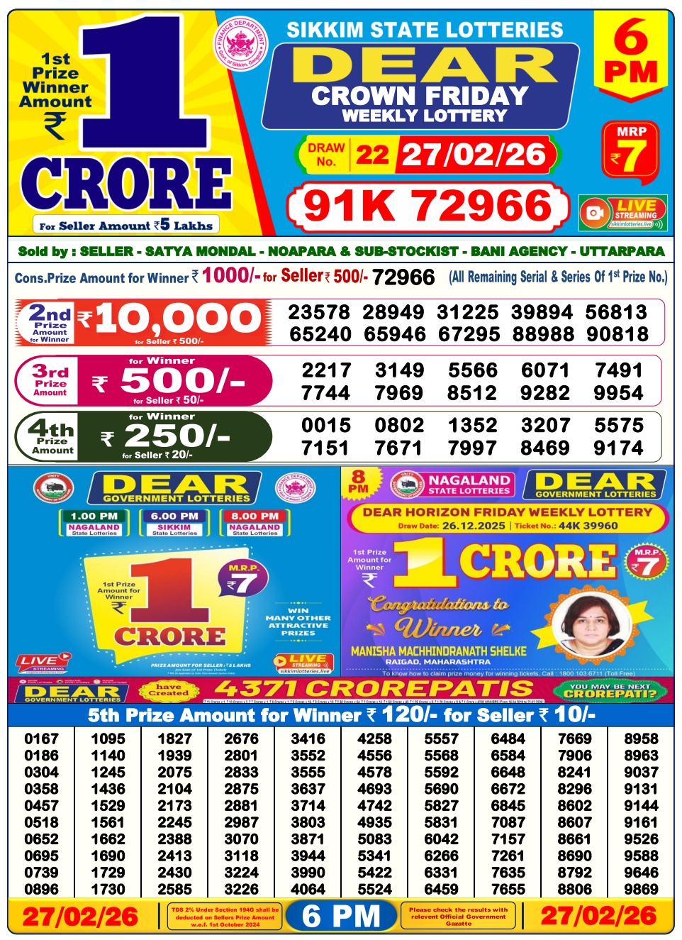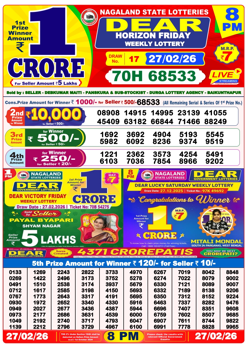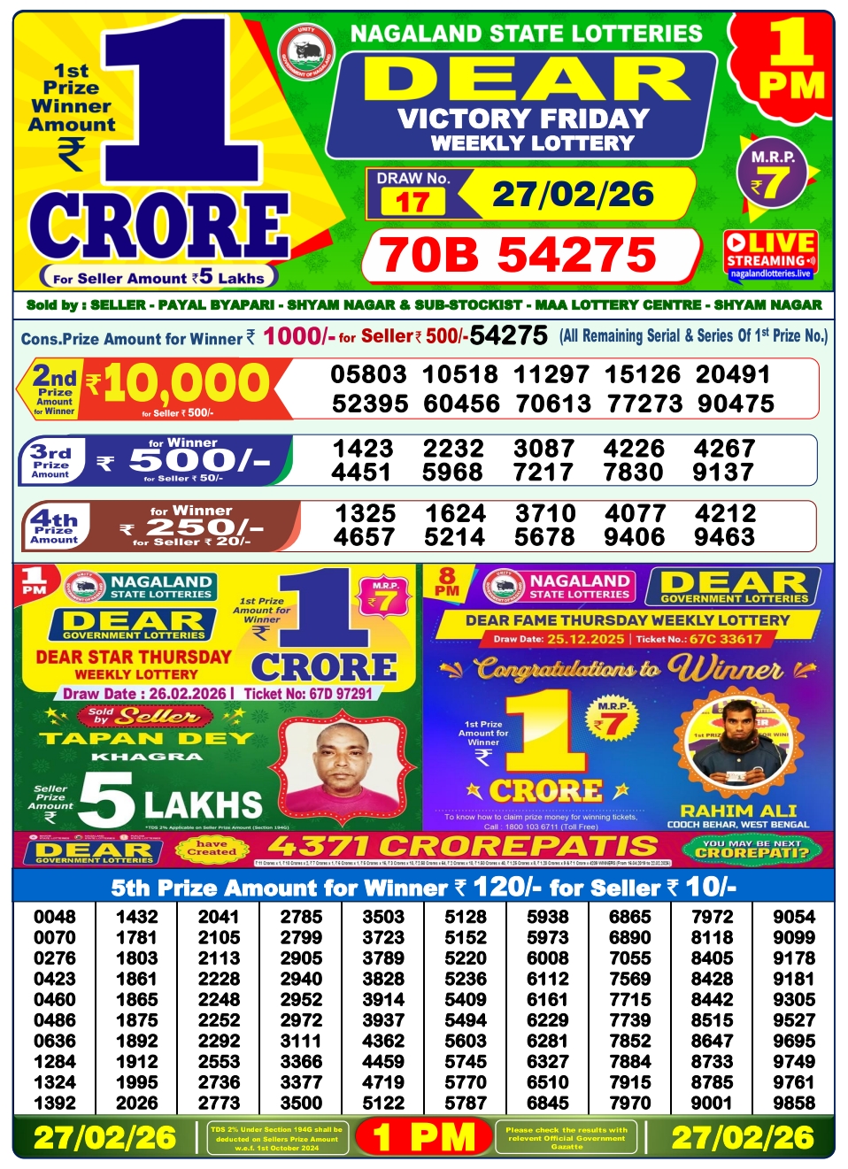 Lottery Sambad 27.2.2026 Result Today 1 PM, 6 PM, 8 PM Nagaland State Lottery LIVE