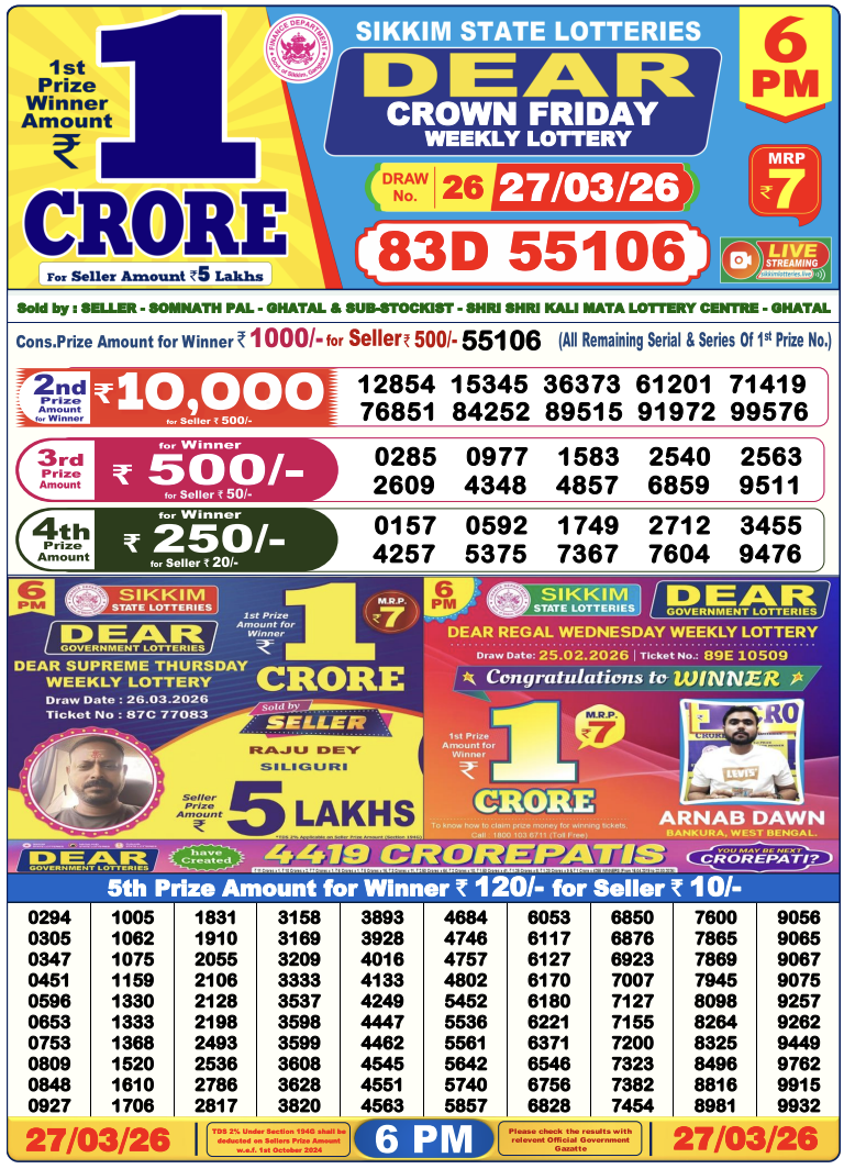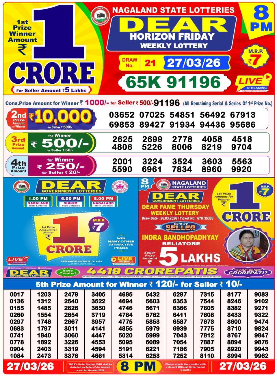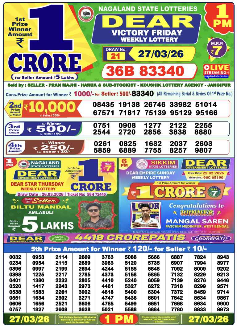 Lottery Sambad 27.3.2026 Result Today 1 PM, 6 PM, 8 PM Nagaland State Lottery LIVE