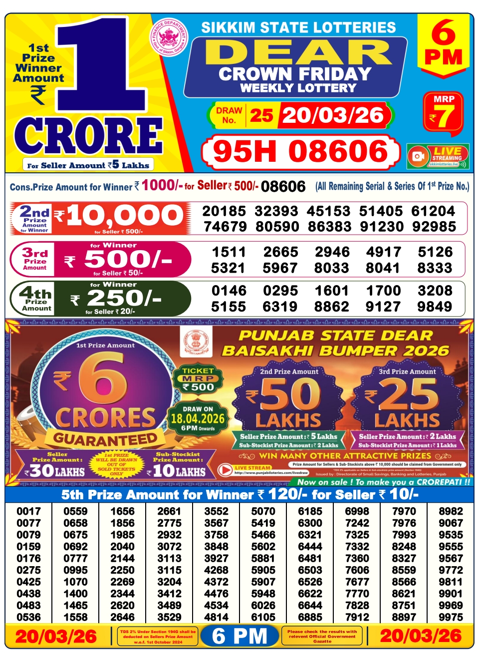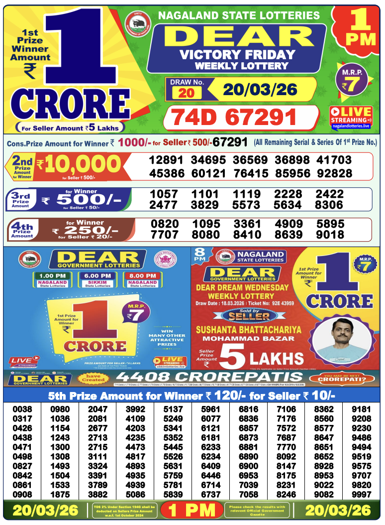 Lottery Sambad 20.3.2026 Result Today 1 PM, 6 PM, 8 PM Nagaland State Lottery LIVE