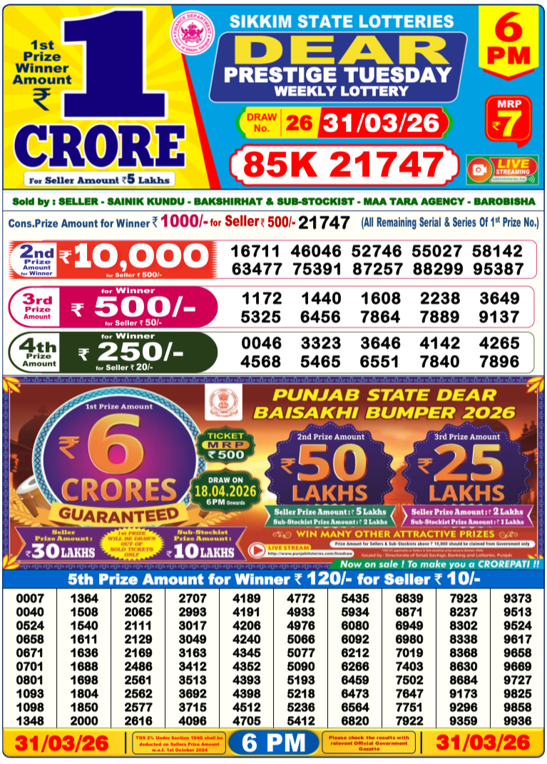 Lottery Sambad 31.3.2026 Result Today 1 PM, 6 PM, 8 PM Nagaland State Lottery LIVE