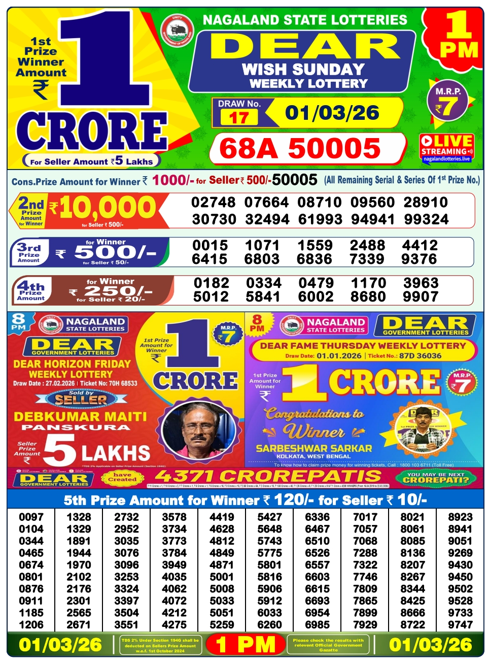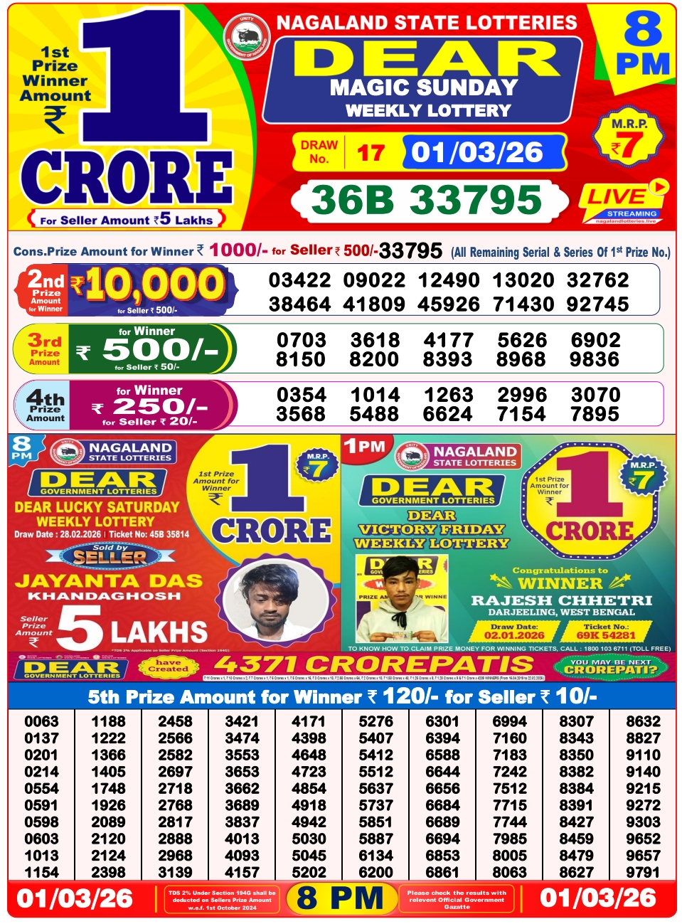 Lottery Sambad 1.3.2026 Result Today 1 PM, 6 PM, 8 PM Nagaland State Lottery LIVE