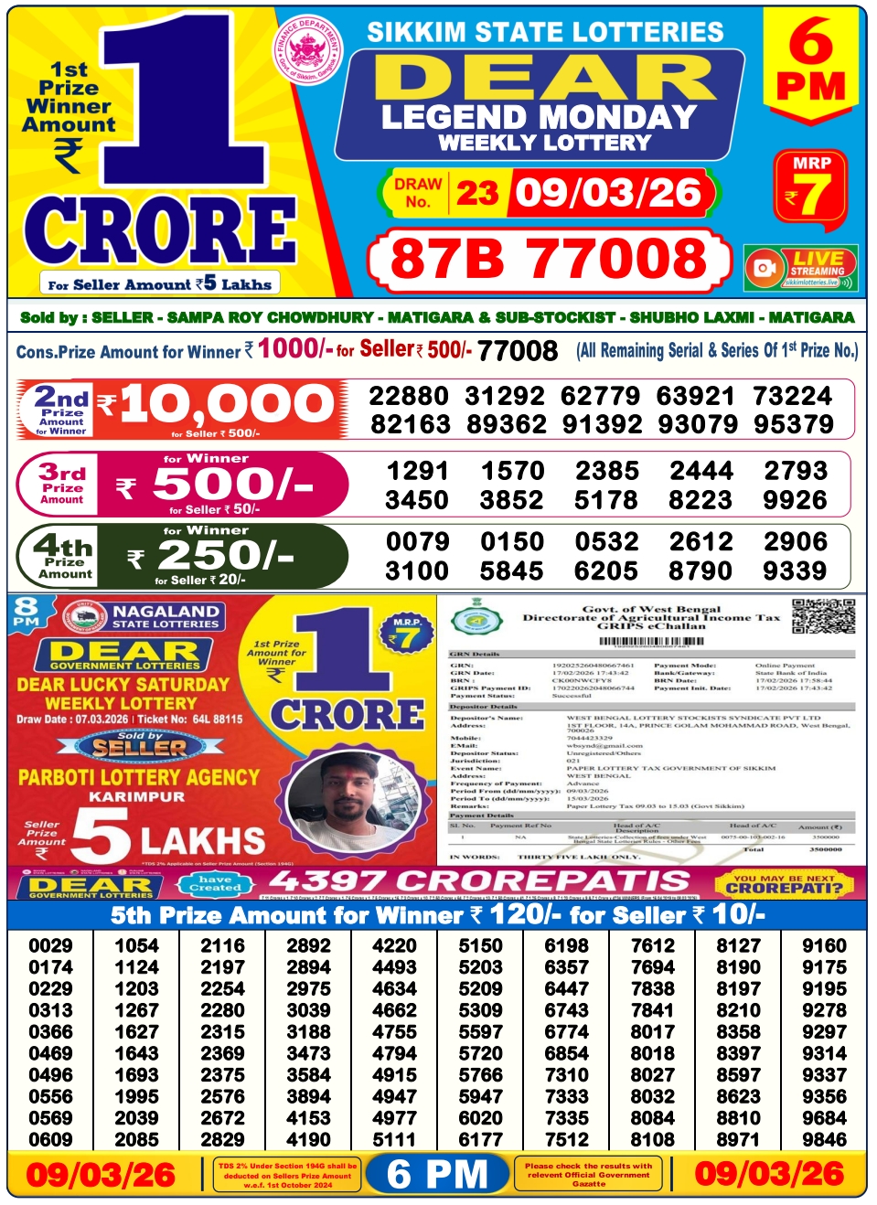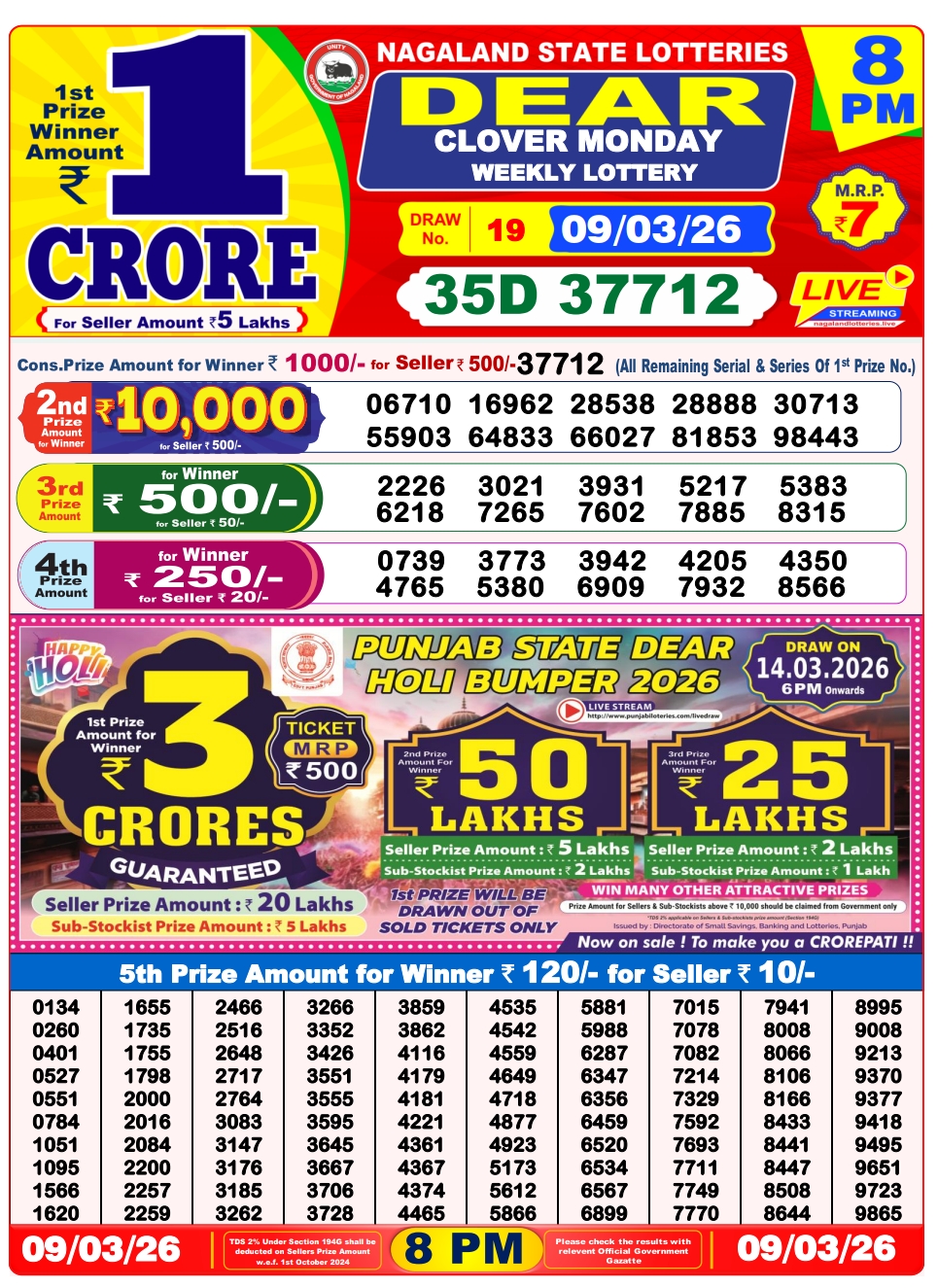 Lottery Sambad 9.3.2026 Result Today 1 PM, 6 PM, 8 PM Nagaland State Lottery LIVE