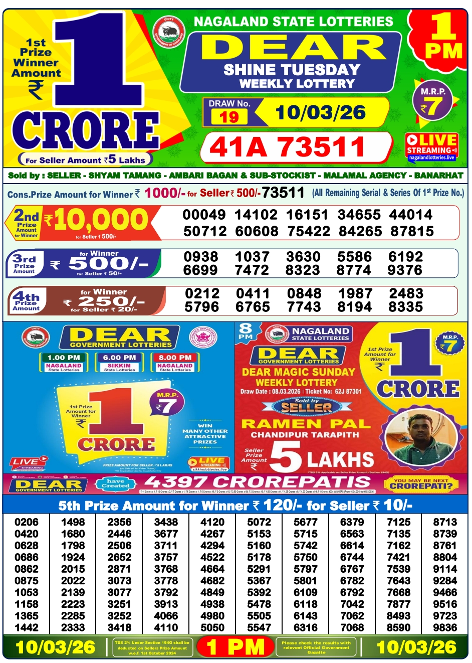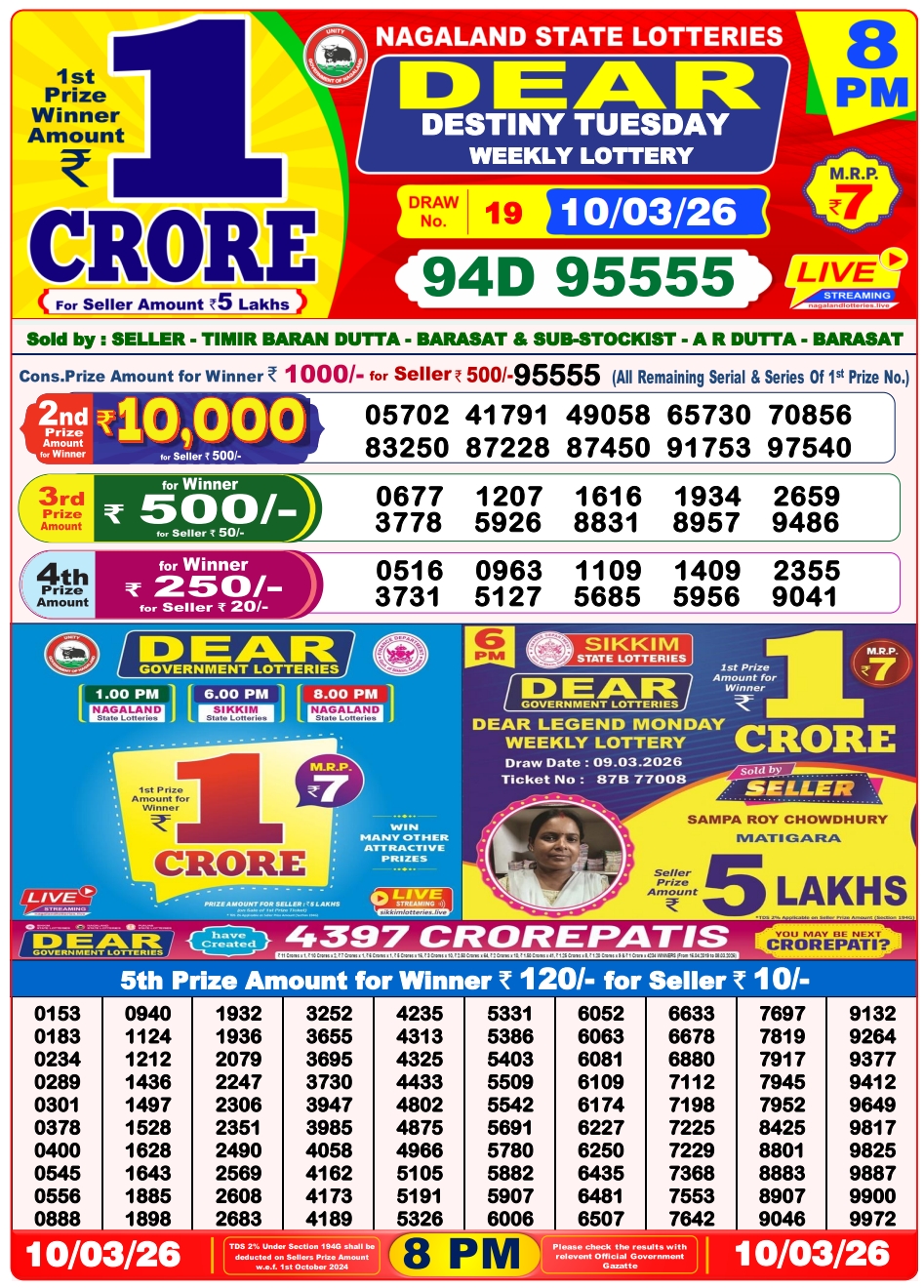 Lottery Sambad 10.3.2026 Result Today 1 PM, 6 PM, 8 PM Nagaland State Lottery LIVE