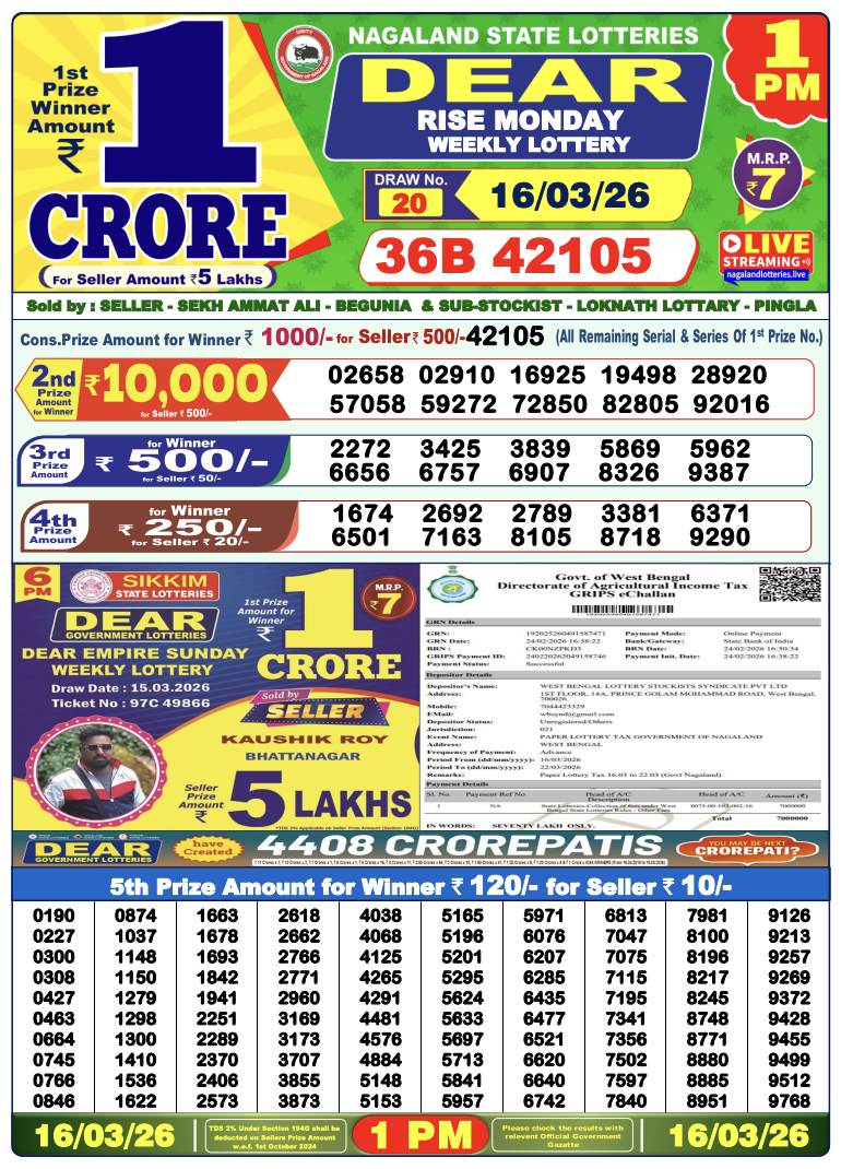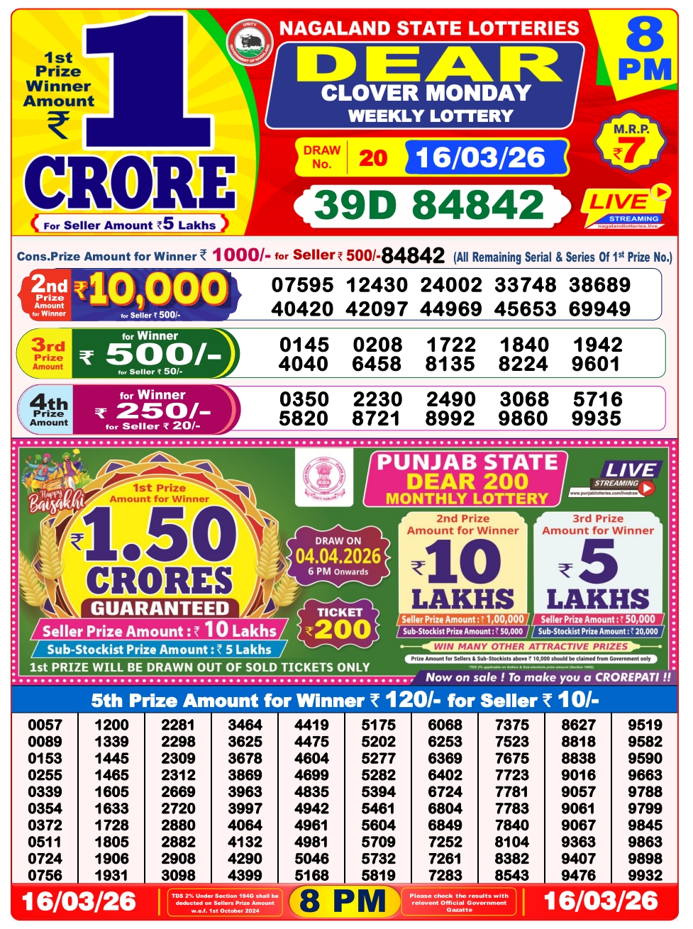 Lottery Sambad 16.3.2026 Result Today 1 PM, 6 PM, 8 PM Nagaland State Lottery LIVE