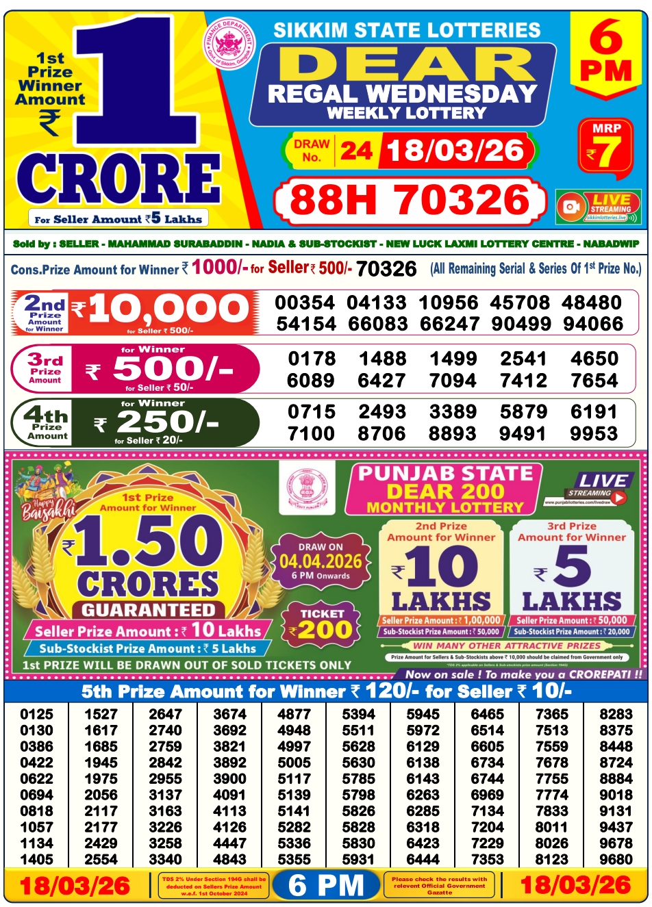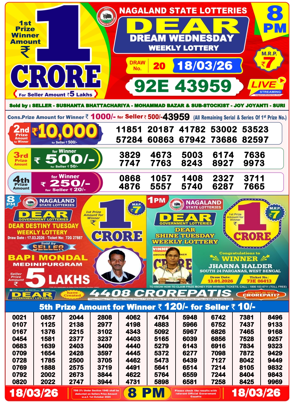 Lottery Sambad 18.3.2026 Result Today 1 PM, 6 PM, 8 PM Nagaland State Lottery LIVE