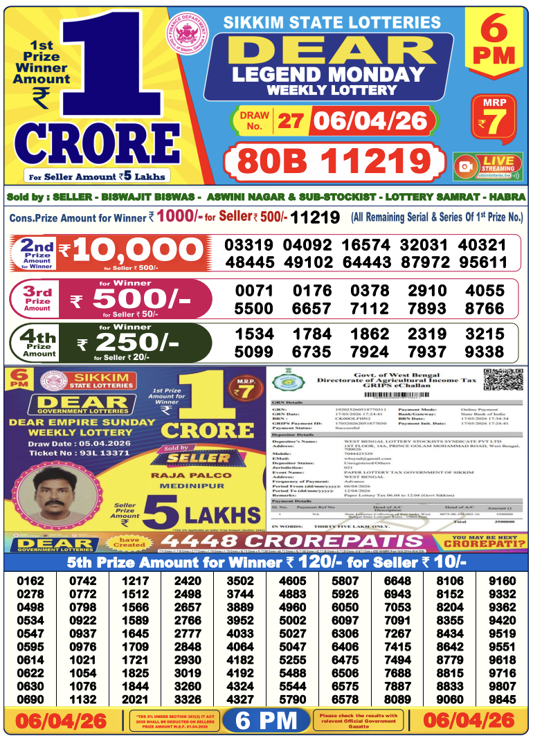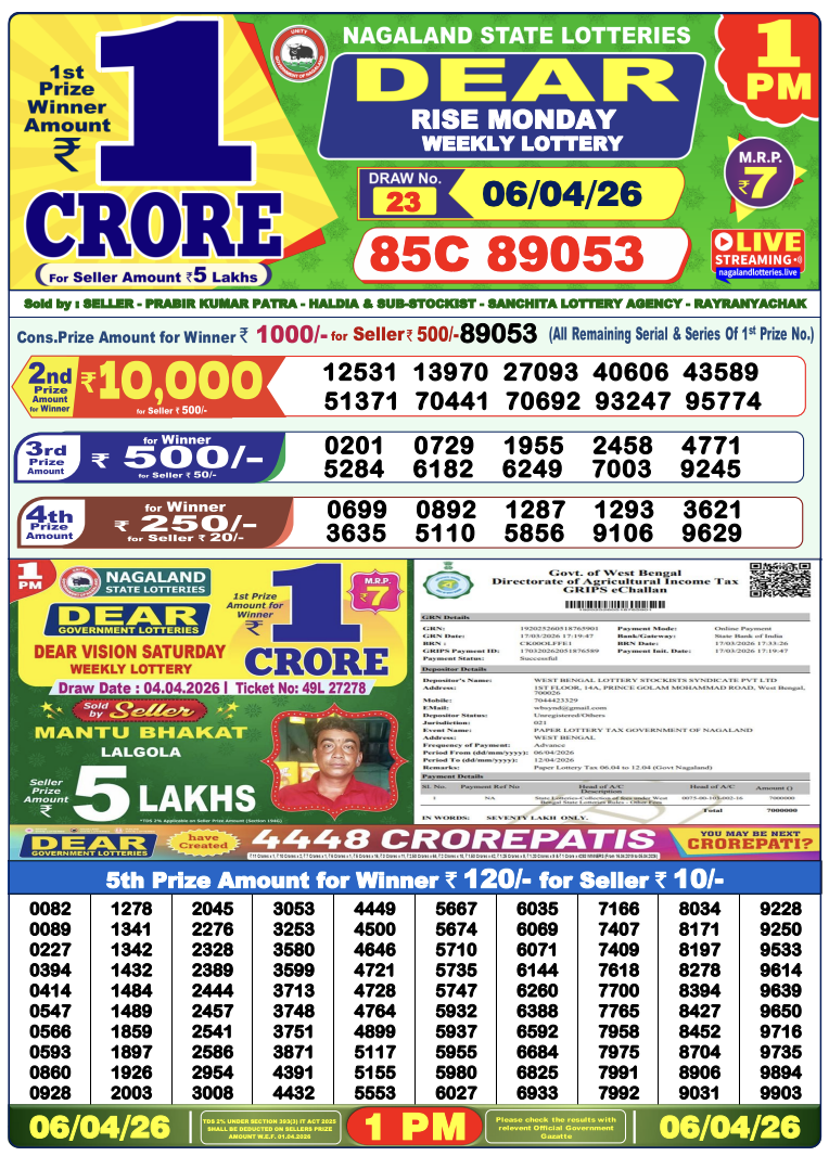 Lottery Sambad 6.4.2026 Result Today 1 PM, 6 PM, 8 PM Nagaland State Lottery LIVE