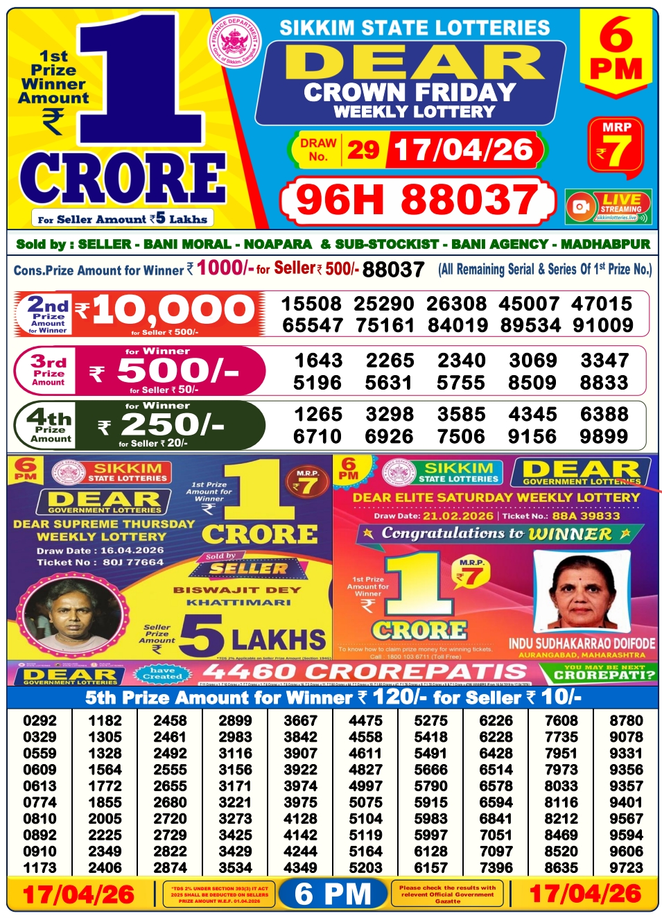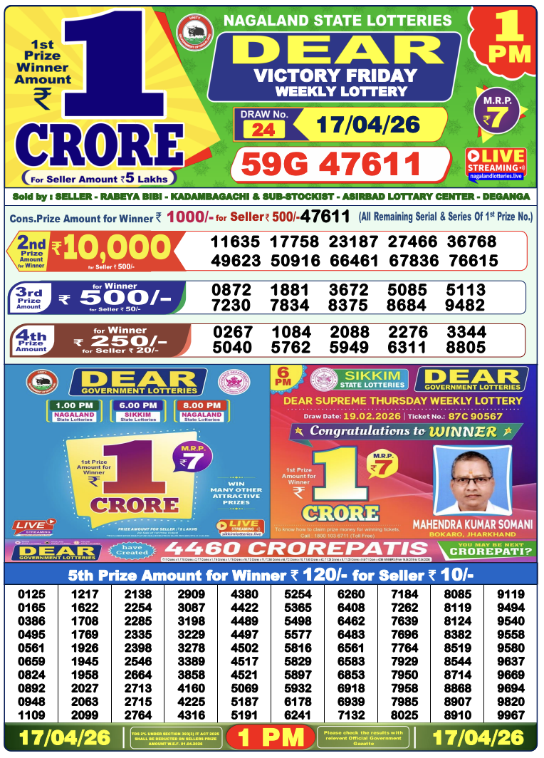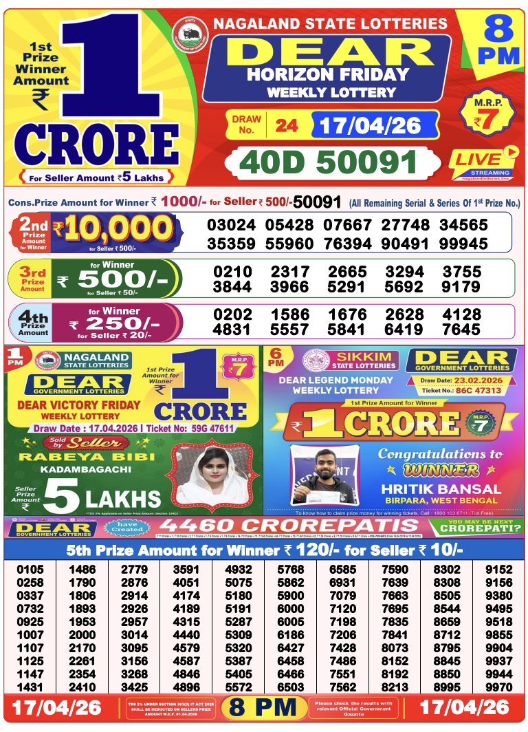 Lottery Sambad 17.4.2026 Result Today 1 PM, 6 PM, 8 PM Nagaland State Lottery LIVE
