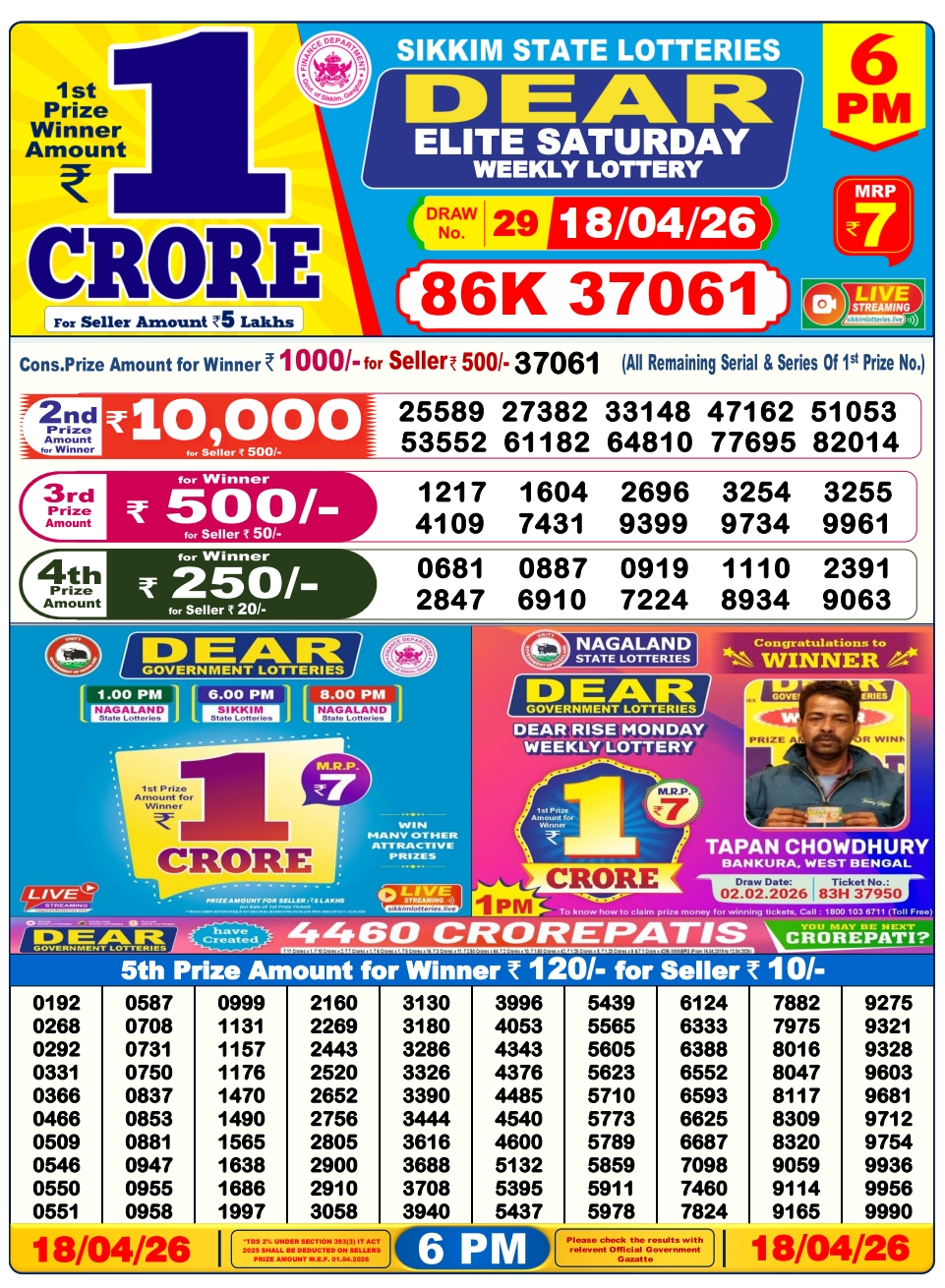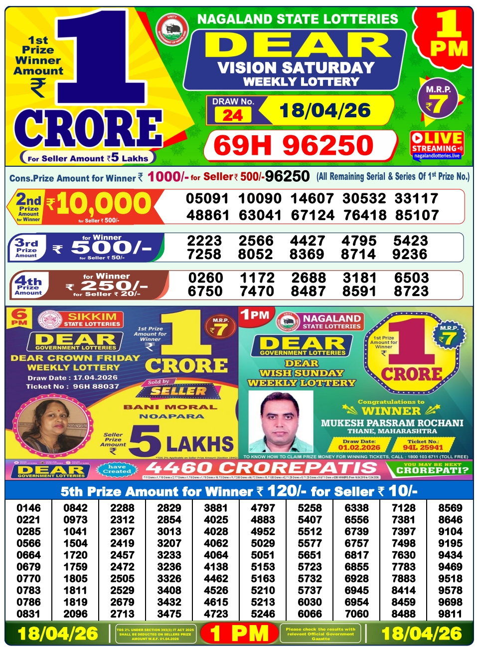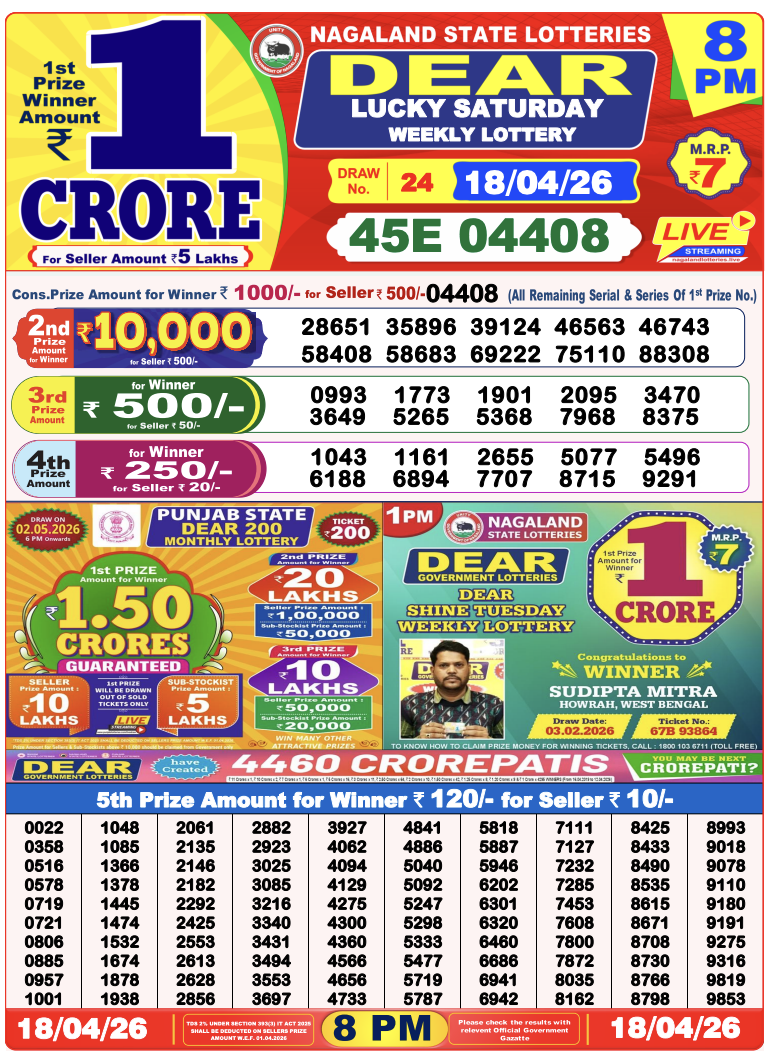 Lottery Sambad 18.4.2026 Result Today 1 PM, 6 PM, 8 PM Nagaland State Lottery LIVE