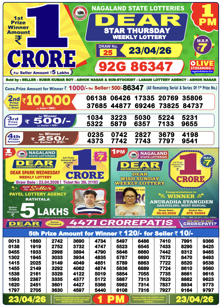 Lottery Sambad 23.4.2026 Result Today 1 PM, 6 PM, 8 PM Nagaland State Lottery LIVE