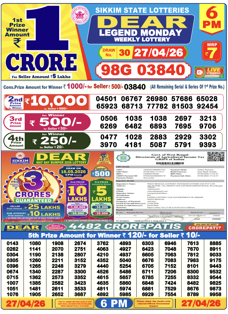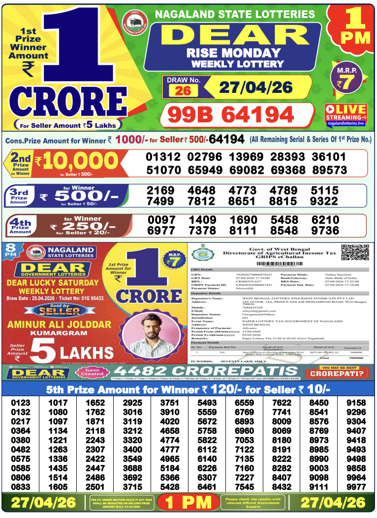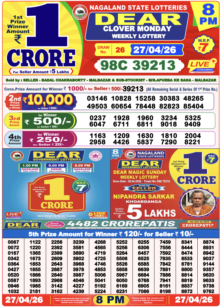 Lottery Sambad 26.4.2026 Result Today 1 PM, 6 PM, 8 PM Nagaland State Lottery LIVE