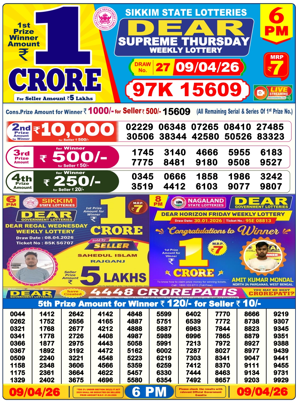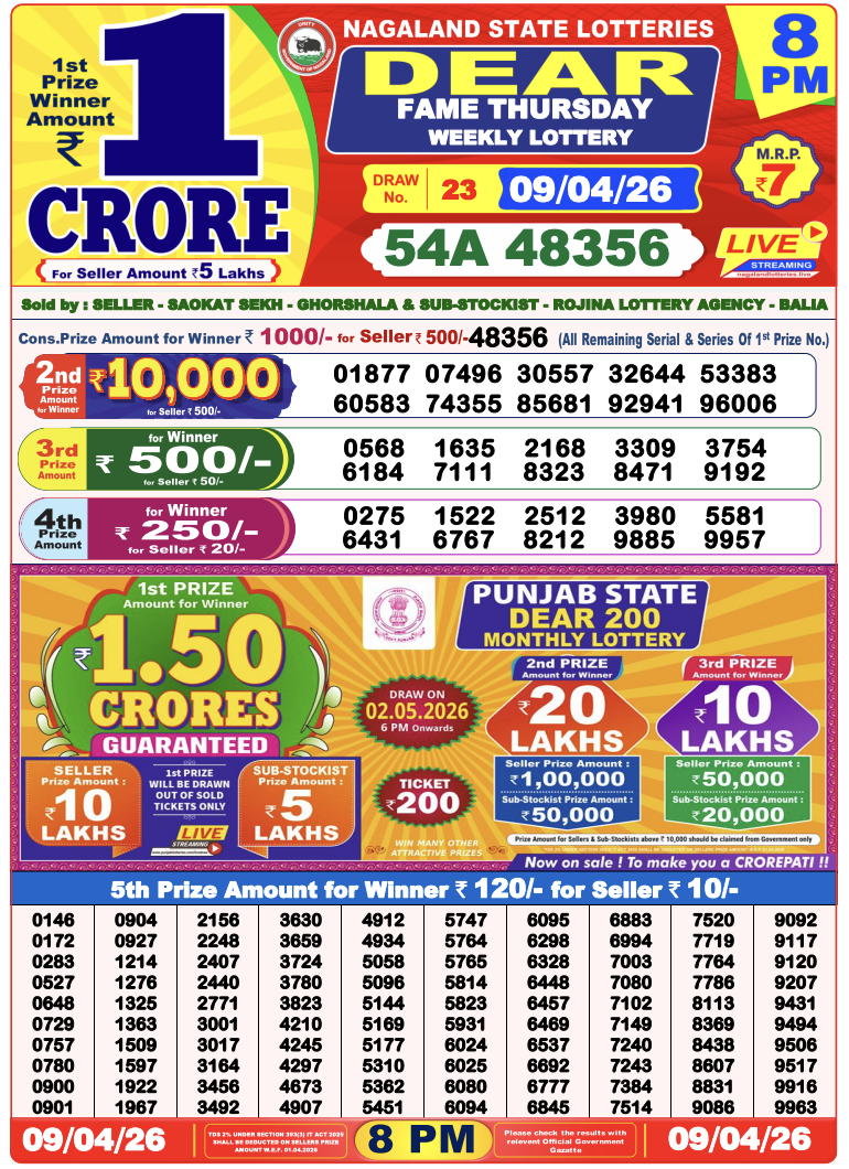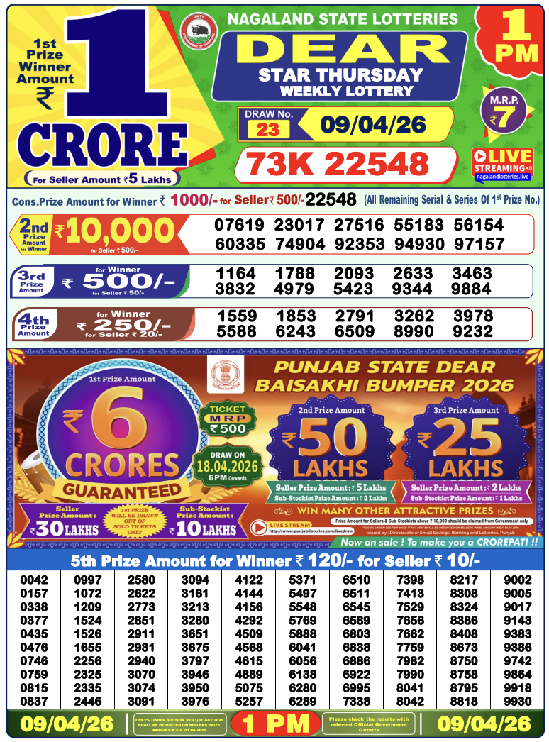 Lottery Sambad 9.4.2026 Result Today 1 PM, 6 PM, 8 PM Nagaland State Lottery LIVE