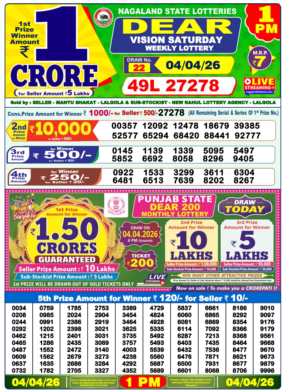 Lottery Sambad 4.4.2026 Result Today 1 PM, 6 PM, 8 PM Nagaland State Lottery LIVE