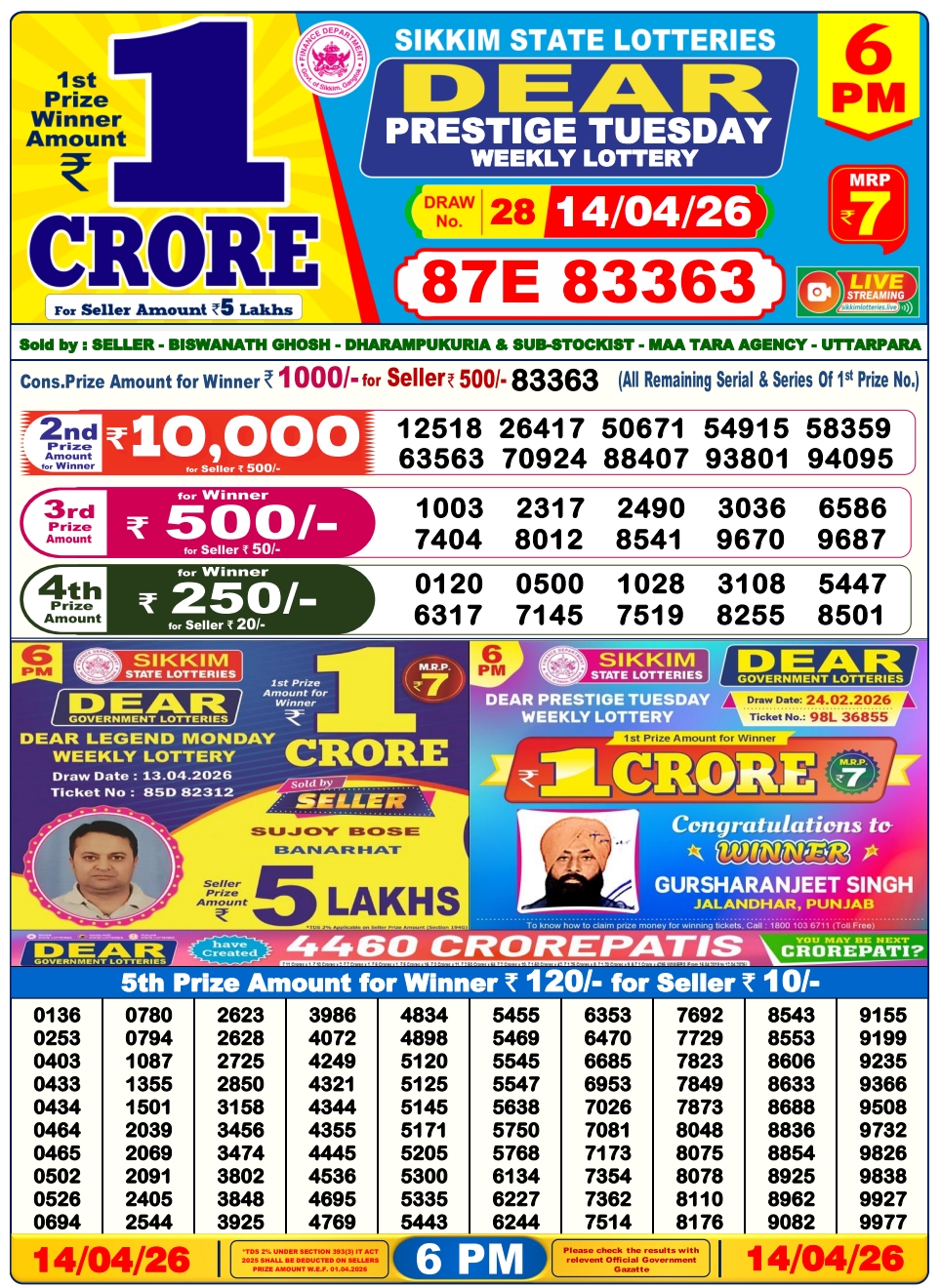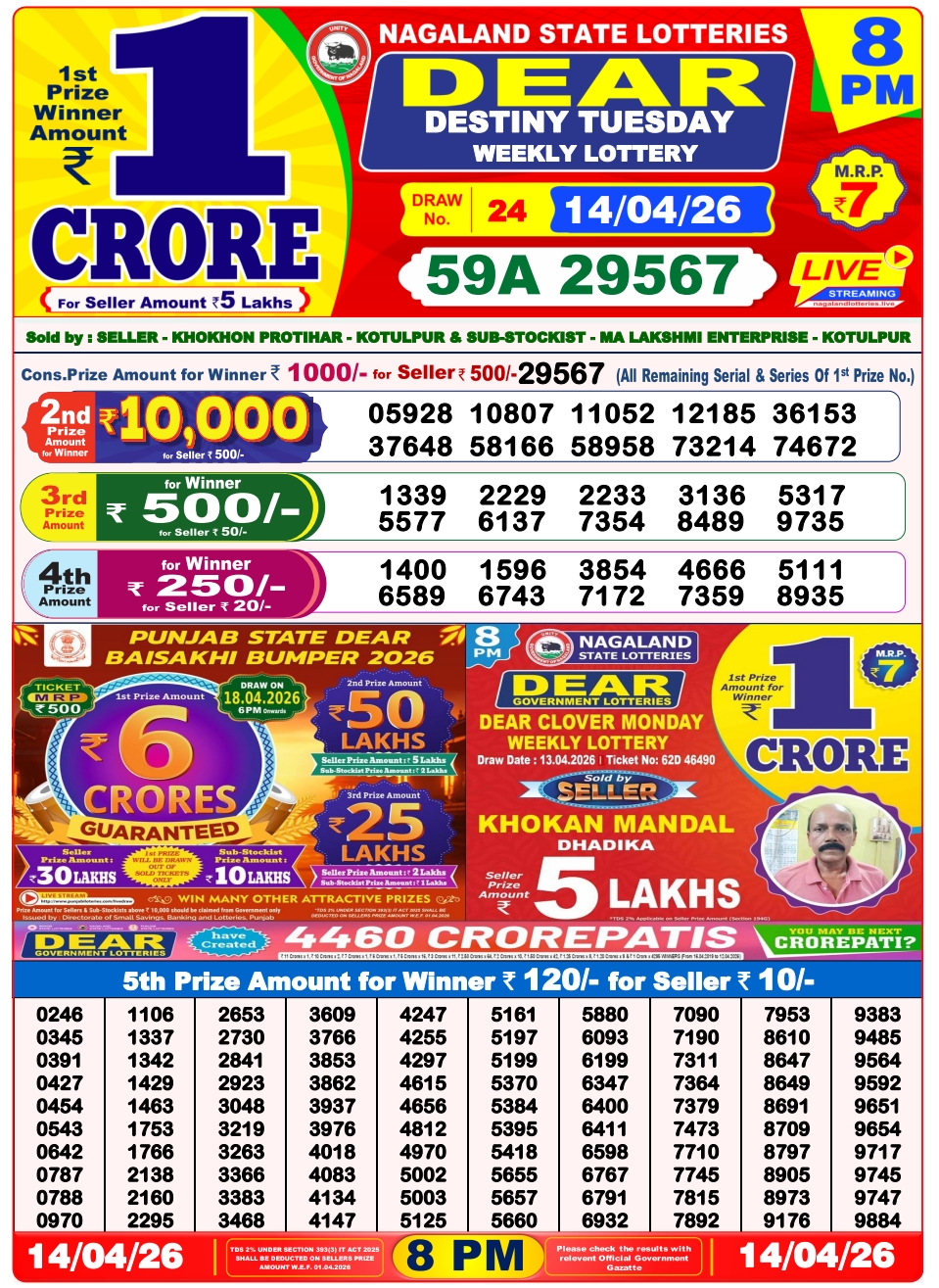 Lottery Sambad 14.4.2026 Result Today 1 PM, 6 PM, 8 PM Nagaland State Lottery LIVE