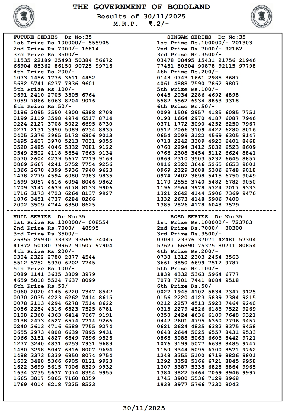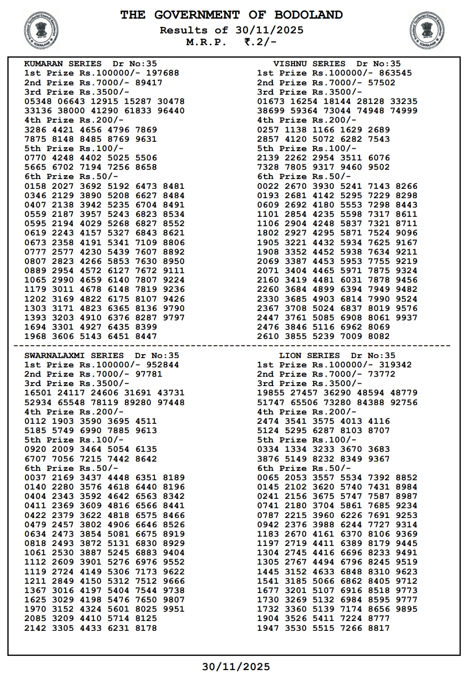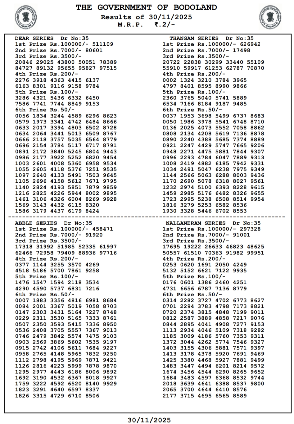 Bodoland Lottery Result 30.11.2025