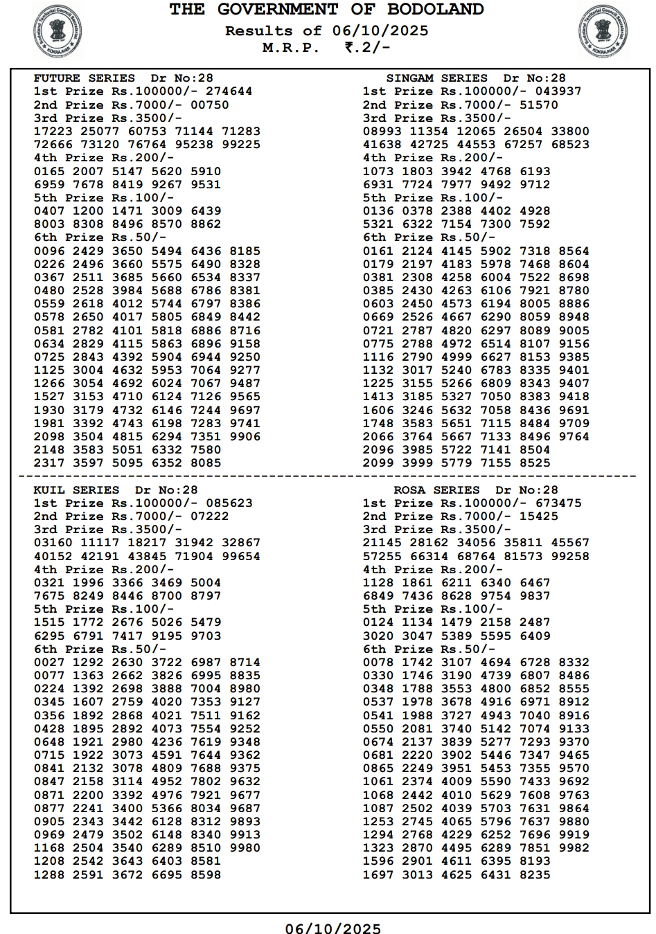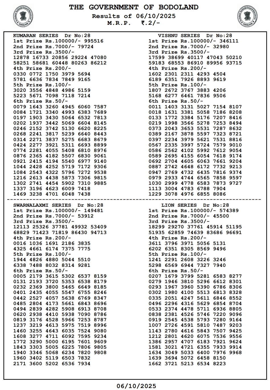 Bodoland Lottery Result’s Today 6.10.2025 Overview