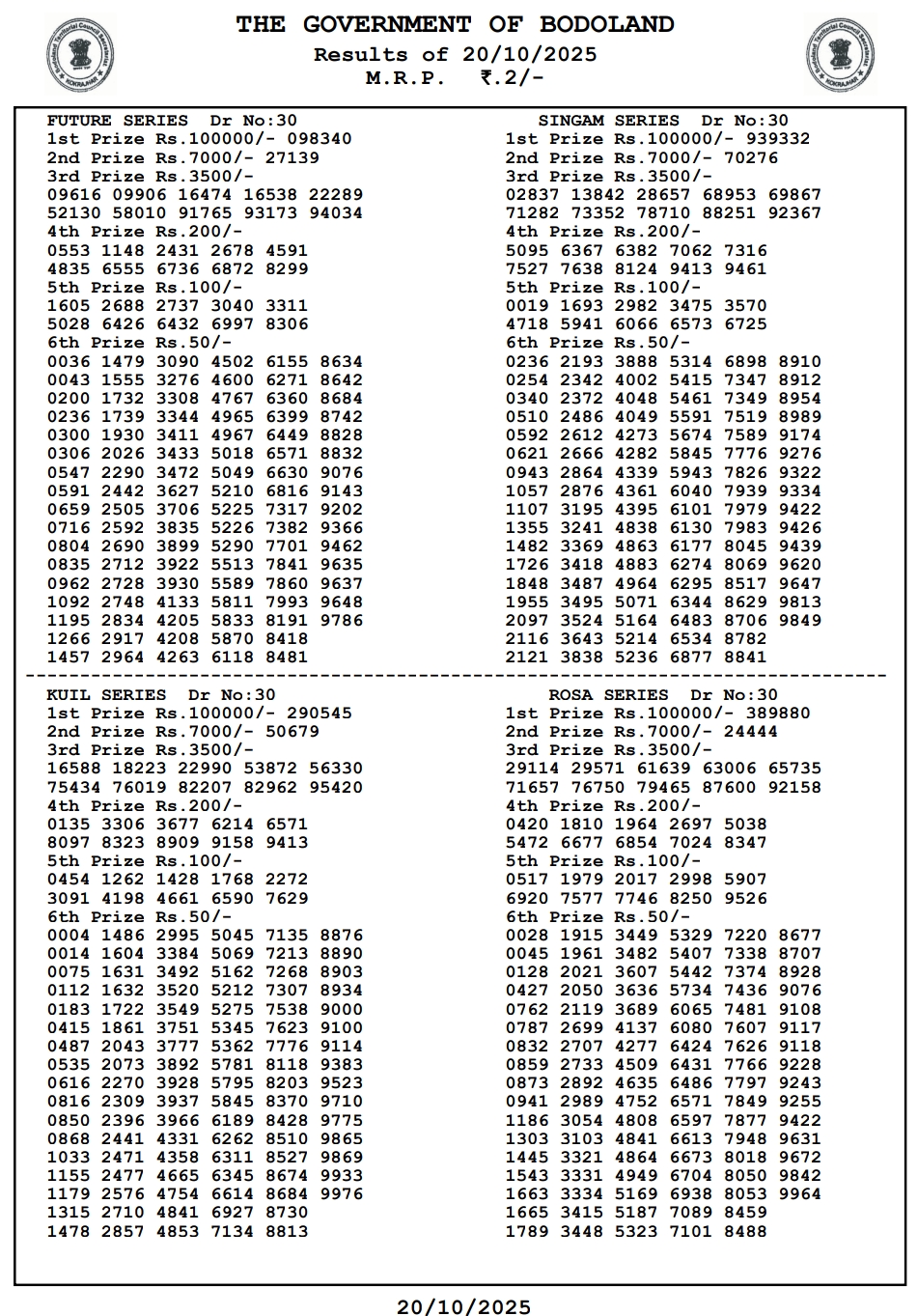 - Every Tuesday- Bodoland Singam Kuil Green Tuesday Weekly Lottery Result