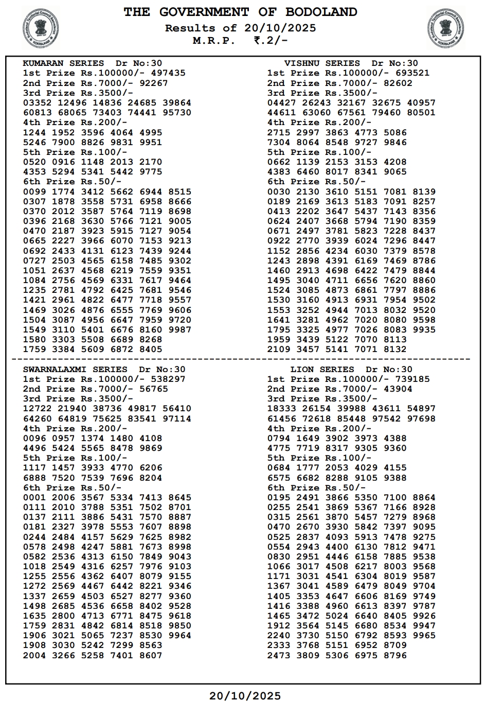 The results of the Assam State Bodoland Kumaran Vishnu Lottery Sambad are above. You can just check it or download it in pdf, png format also.