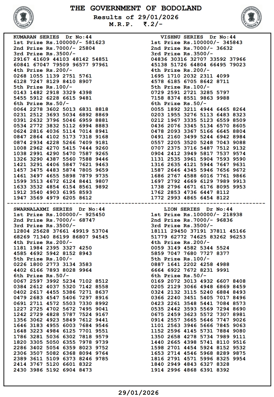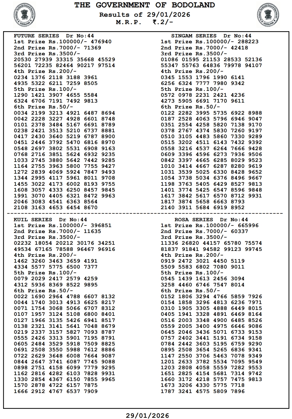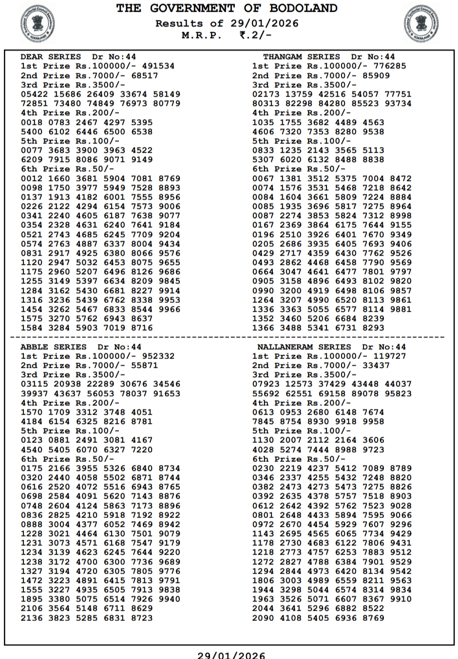 Bodoland Lottery Result 29.1.2026
