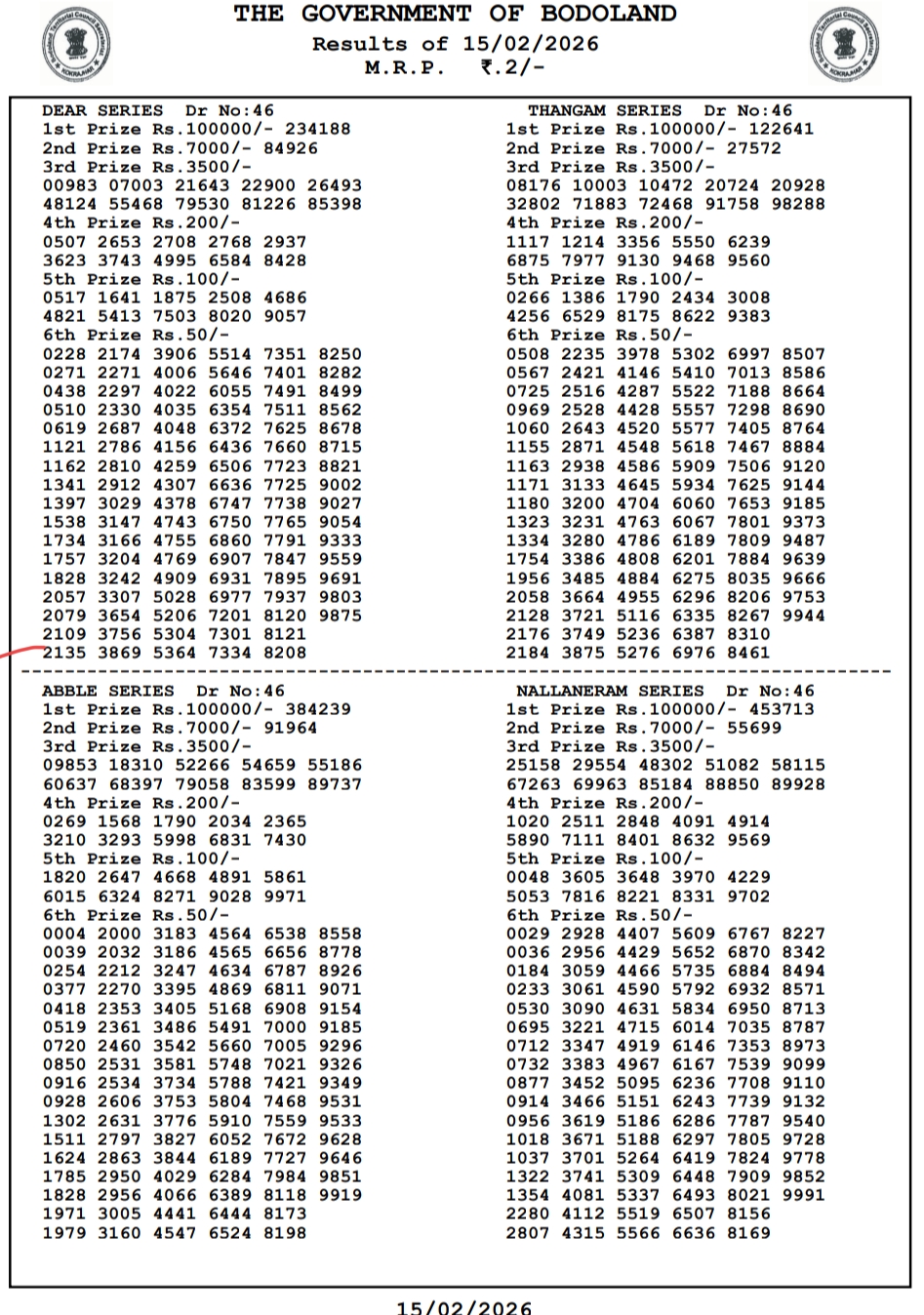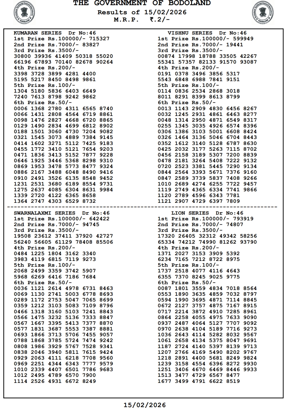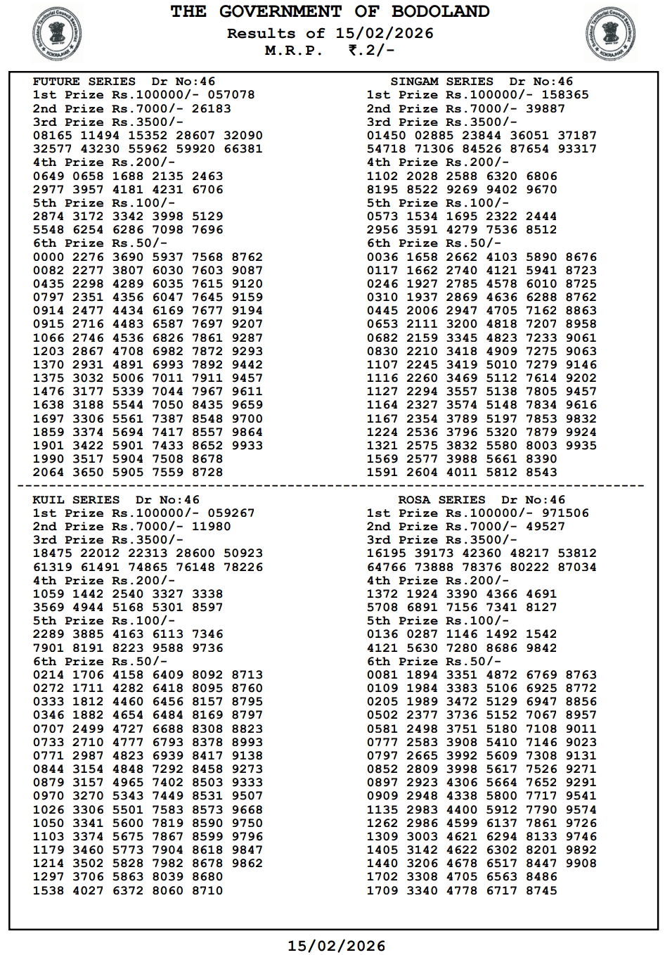 Bodoland Lottery Result 15.2.2026