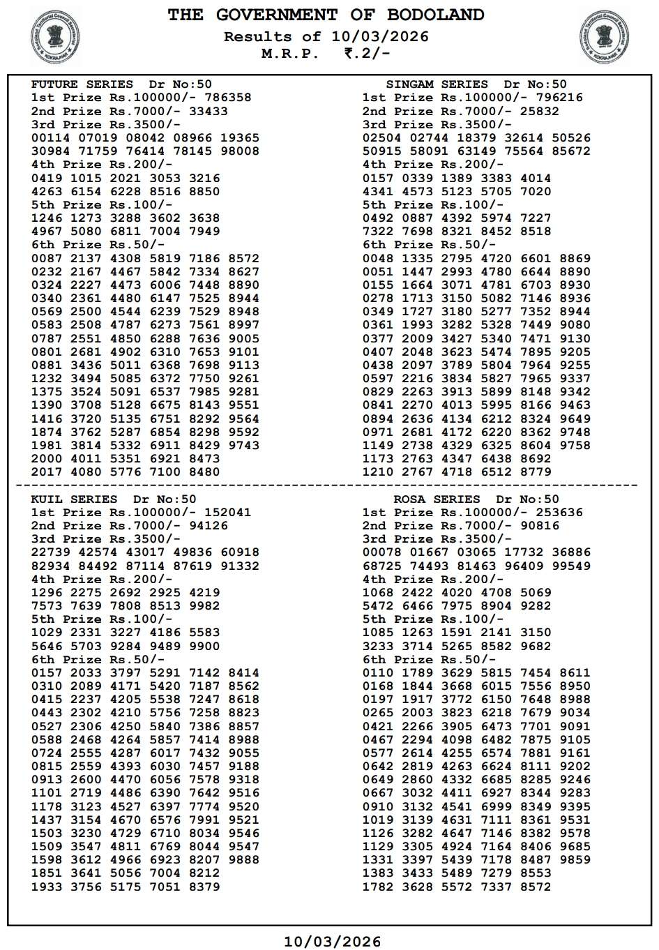 - Every Sunday- Bodoland Singam Kuil Blue Sunday Weekly Lottery Result