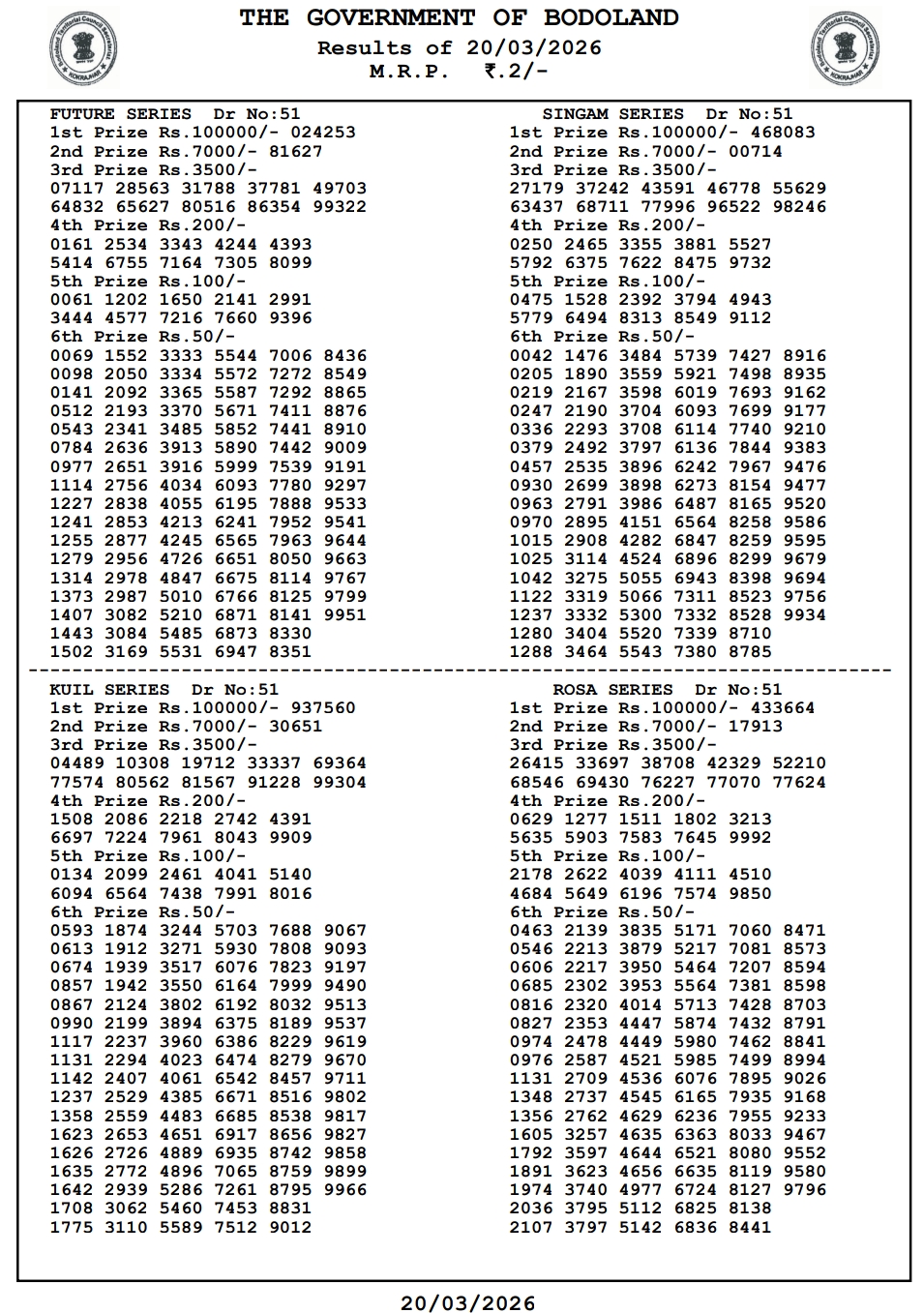 Bodoland Lottery Result’s Today 20.3.2026 Overview