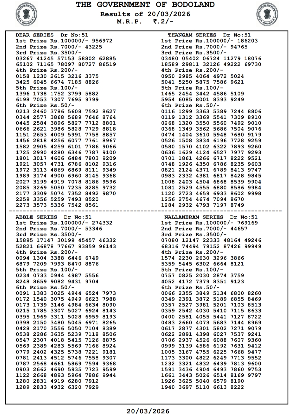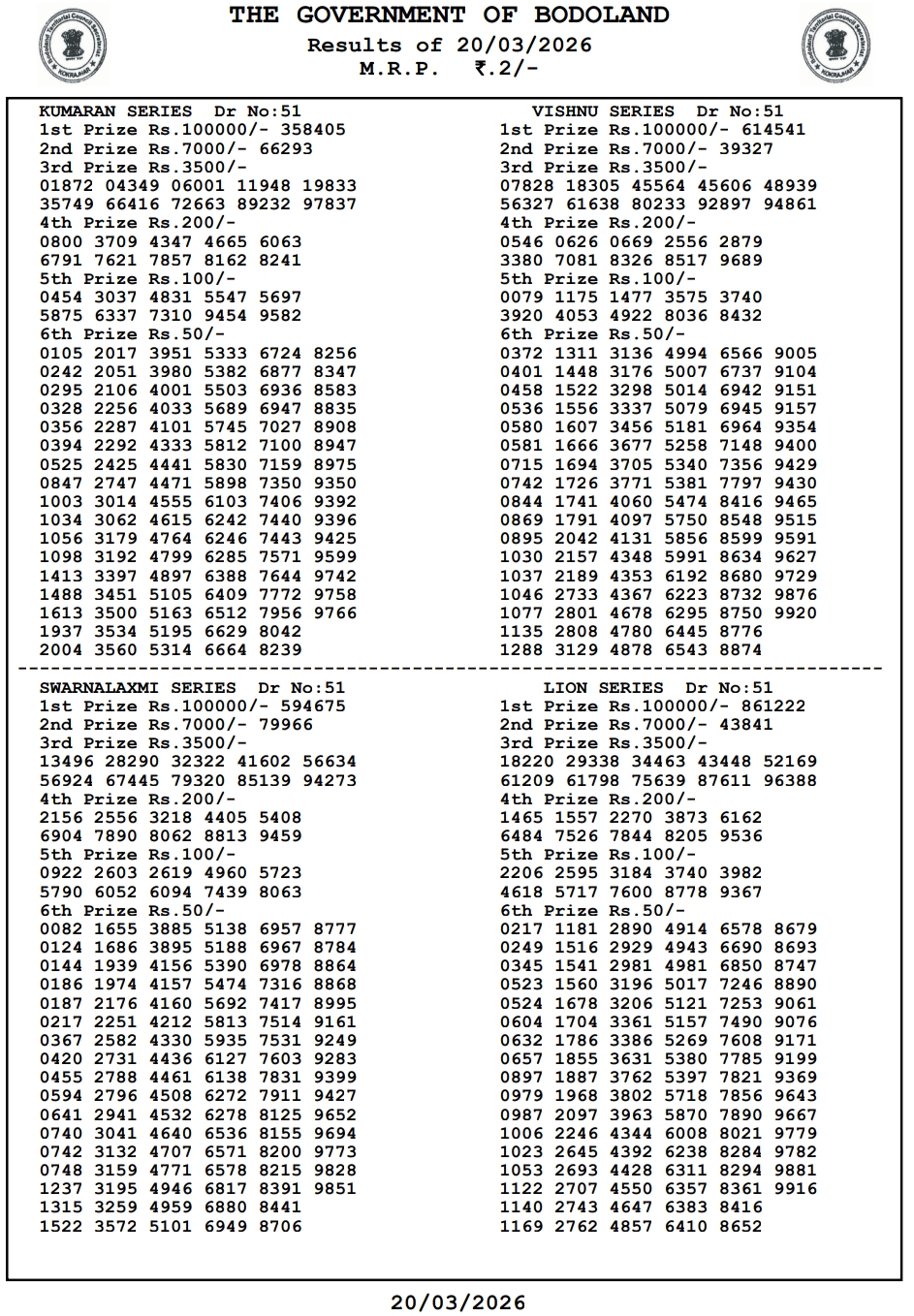 Bodoland Lottery Result 20.3.2026 Today Assam State Lottery 12 PM 3 PM 7 PM: Here you can find Bodoland Lottery Result Today, Bodoland Lottery Result, Bodoland Lottery Result, Assam State Lottery Sambad Result, Bodoland Lottery Singam Kuil Result, Bodoland Lottery Rosa Deer Result, Bodoland Lottery Thangam Nallaneram Result, Bodoland Lottery Kumaran Vishnu Result, Bodoland Lottery Swarnalaxmi Result, Bodoland Lottery Vairam Result, Bodoland Lottery Mani Result, Bodoland Lottery Lion Live Result, Bodoland Lottery Result 12 PM 3 PM 7 PM, Assam State Lottery Result, Bodoland Lottery Draw List, Bodoland Lottery Evening Draw List, Bodoland Lottery Sambad Night Draw List, Bodoland Lottery Sambad Live Results, Dear Bodoland Lottery Results are Below.