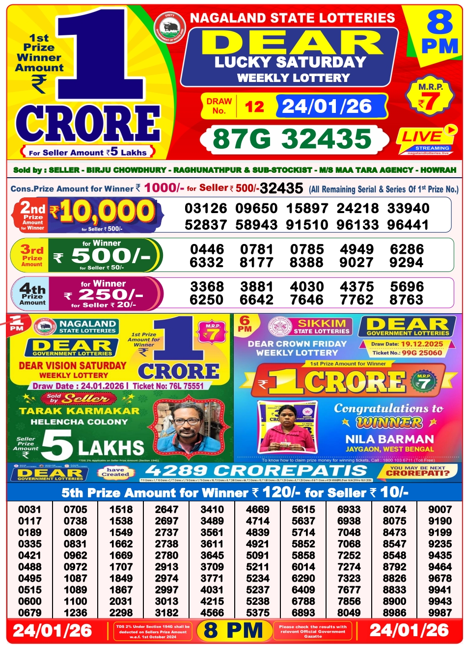 Are you looking for the Nagaland State Lottery 24.1.2026 Night 8 PM Result? If yes, you are on the right webpage. If you have purchased the ticket for the Nagaland State Lottery, then you are on the right page, here we regularly publish Nagaland State Lottery Sambad night results every day. Every night at 8 PM, countless individuals eagerly await the announcement of the Nagaland State Lottery Sambad Night Result. This lottery, run by the government of Nagaland, has become a beacon of hope for many, offering them a chance to win substantial prizes.