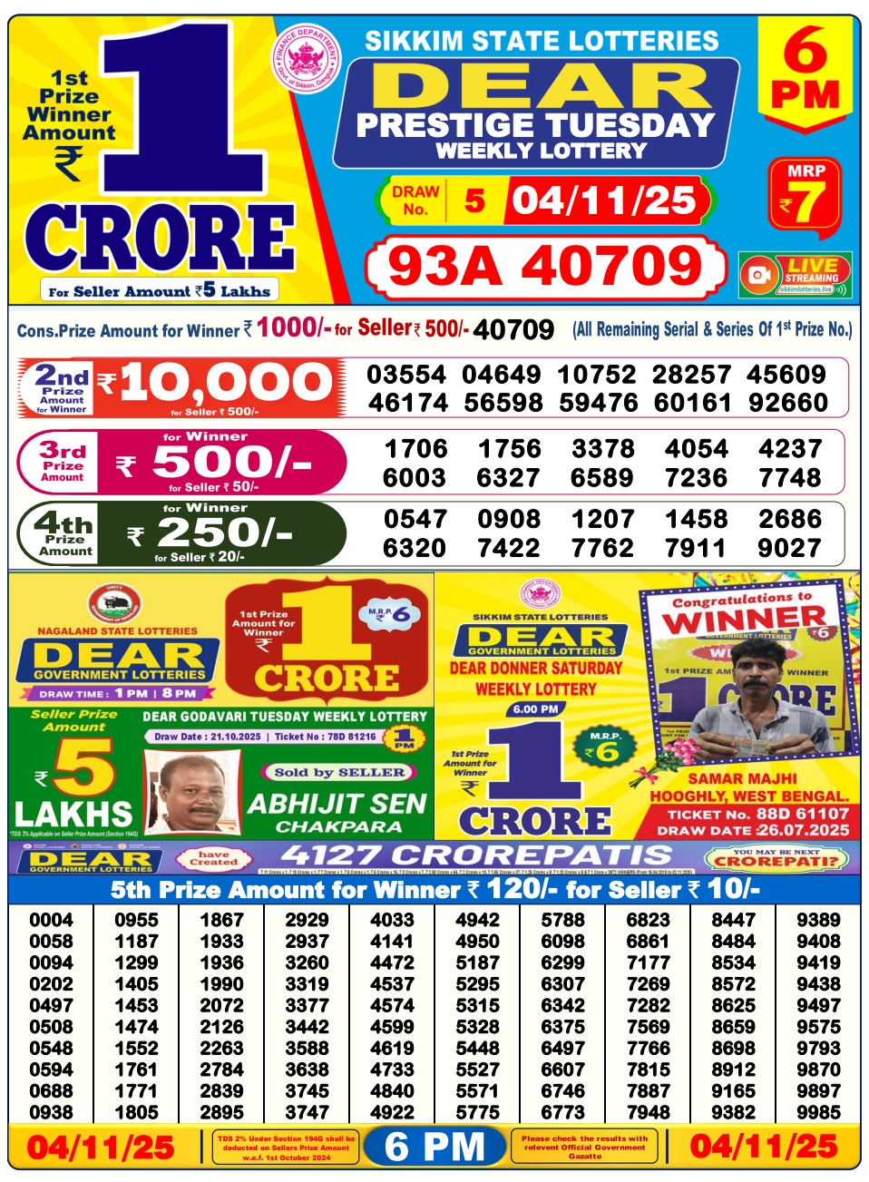 West Bengal State Lottery Sambad Result 4.11.2025 Today 6 PM: Are you looking for West Bengal State Lottery Result at 6 PM? If yes, you are on the right website. Below you can find the West Bengal State Lottery result. West Bengal State Lotteries used to declare the West Bengal State Lottery Result 6 PM. Dear Day is live from 6 PM every day and the official West Bengal State Lottery Results PDF will be available after 6:15 PM on their official website. Here we are updating the live West Bengal State Lottery result at 6 PM. So the people are requested to keep watching this page for Today’s West Bengal State Lottery by 6 PM. Check below the West Bengal State Lottery 6 PM Result PDF file.